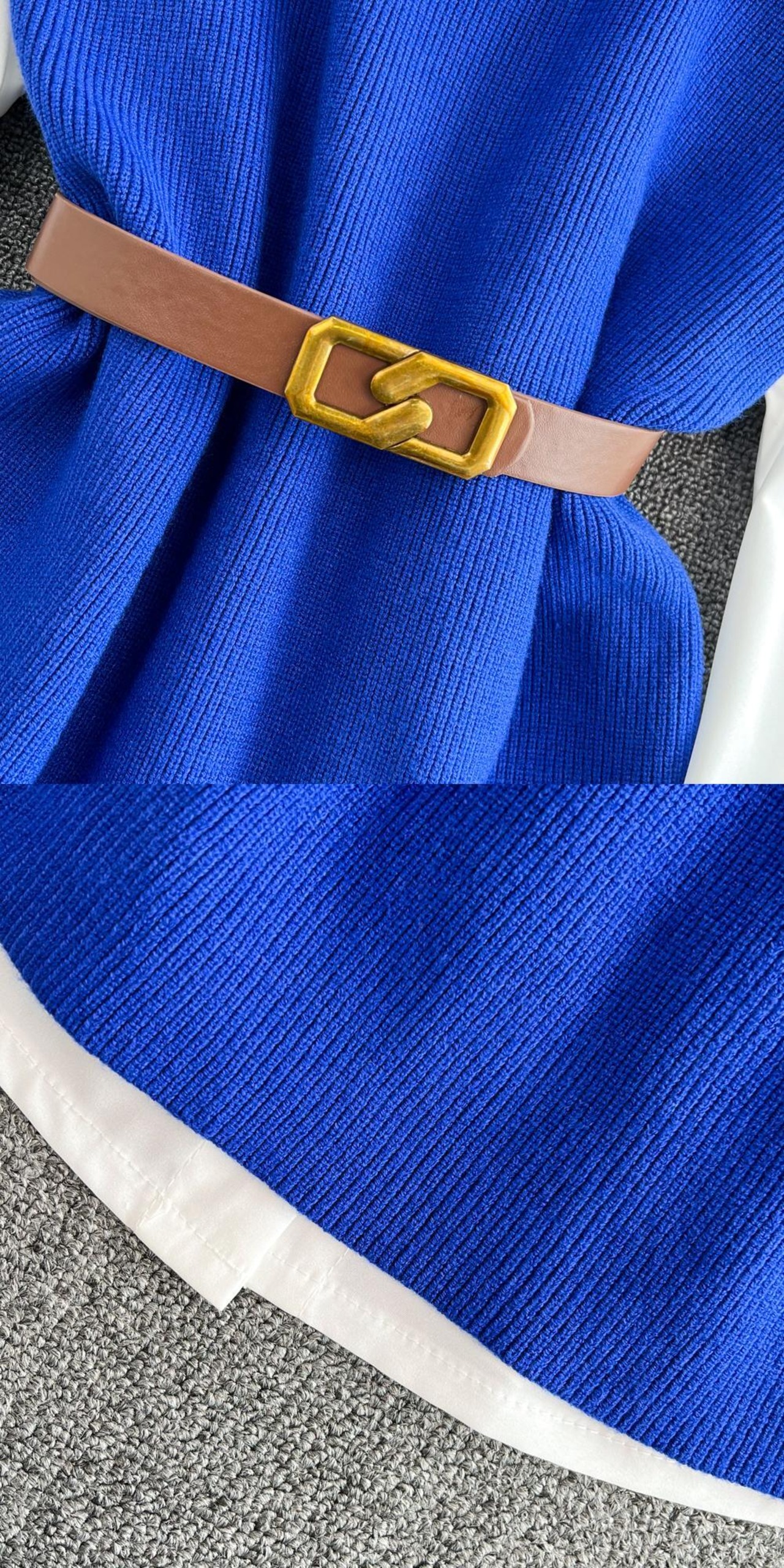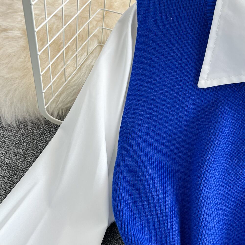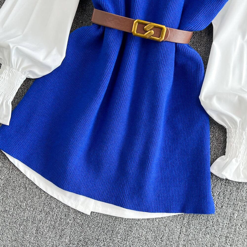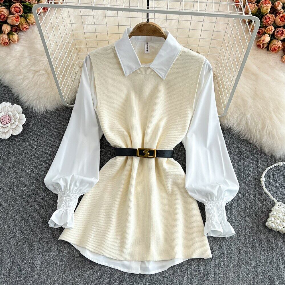 のみくま春ツーピースレディーストップセットランタンスリーブブラウスシャツ+ベルトスリムウエストプルオーバーニットベスト2022 スプリング 春物 ハーネス kor56482971989
