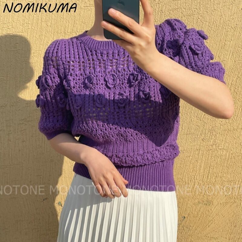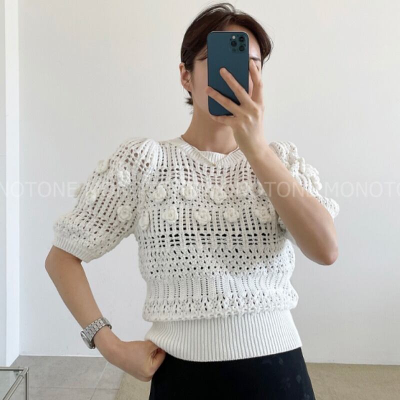 のみくまシック3DフラワーホローアウトレディースセーターCausal半袖ニット2022春夏ニットトップス ショート ハーフスリーブ スプリング 春物 サマー 夏物 フラワーデザイン kor15192921032