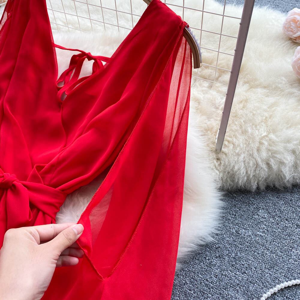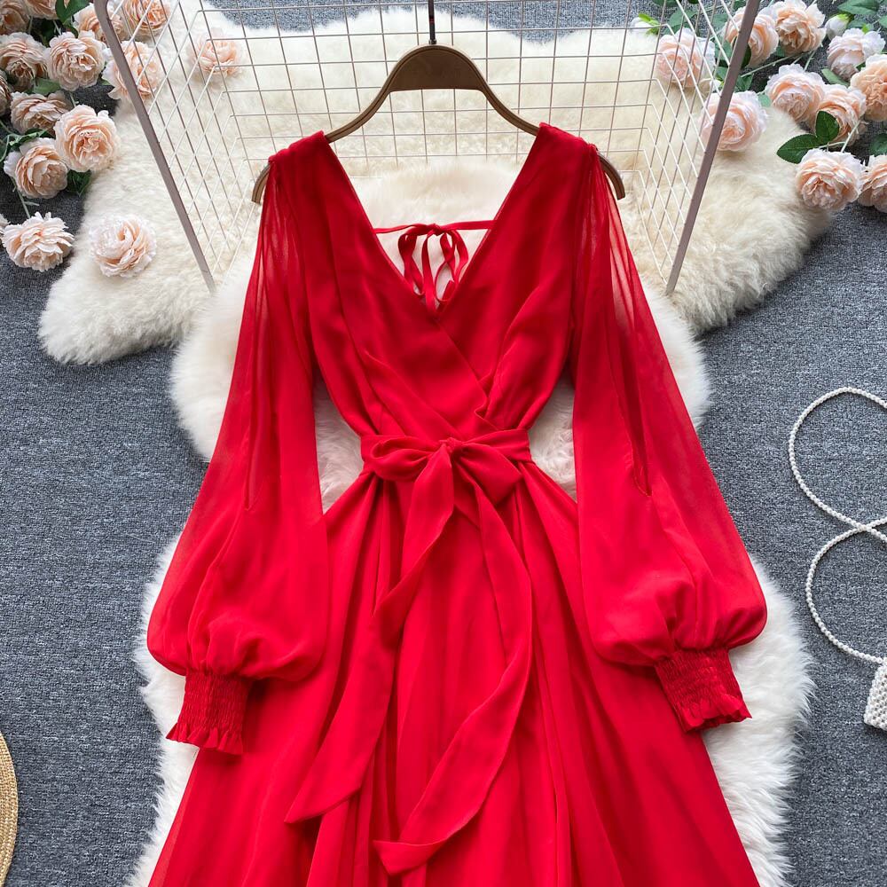 のみくまセクシーなVネックネクタイバックレスドレス女性ランタンスリーブビーチスタイルドレス2022ウエストVestidos kor26352401232
