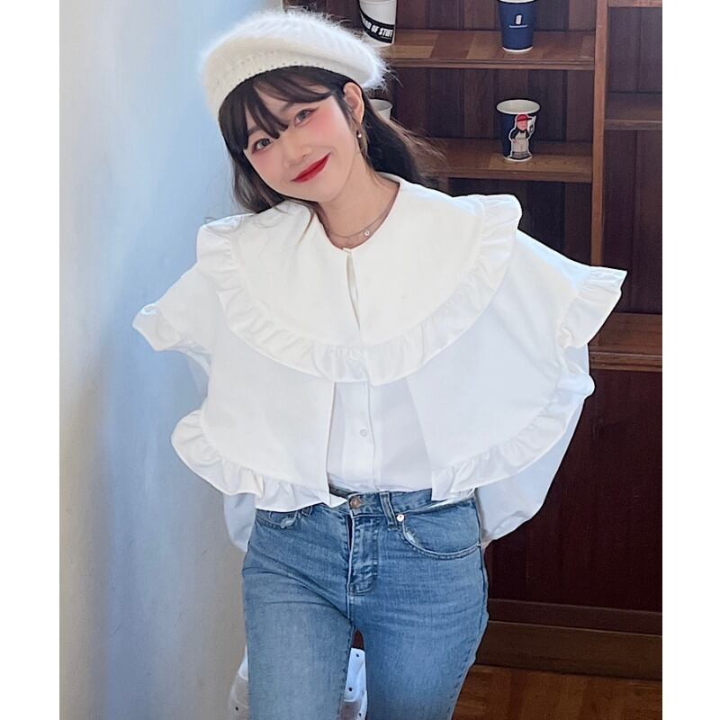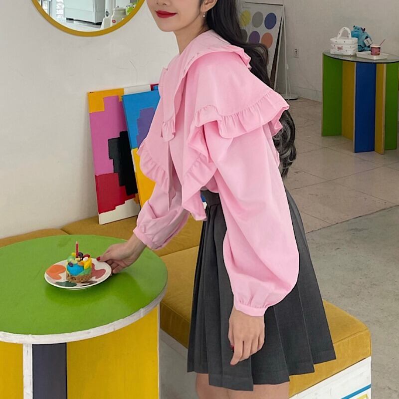 のみくまスウィートピーターパンカラーフリルカジュアルブラウストップススウィートウーマンシャツ2022春秋 大人ガーリー キュート スプリング 春物 オータム 秋物 kor40018207663