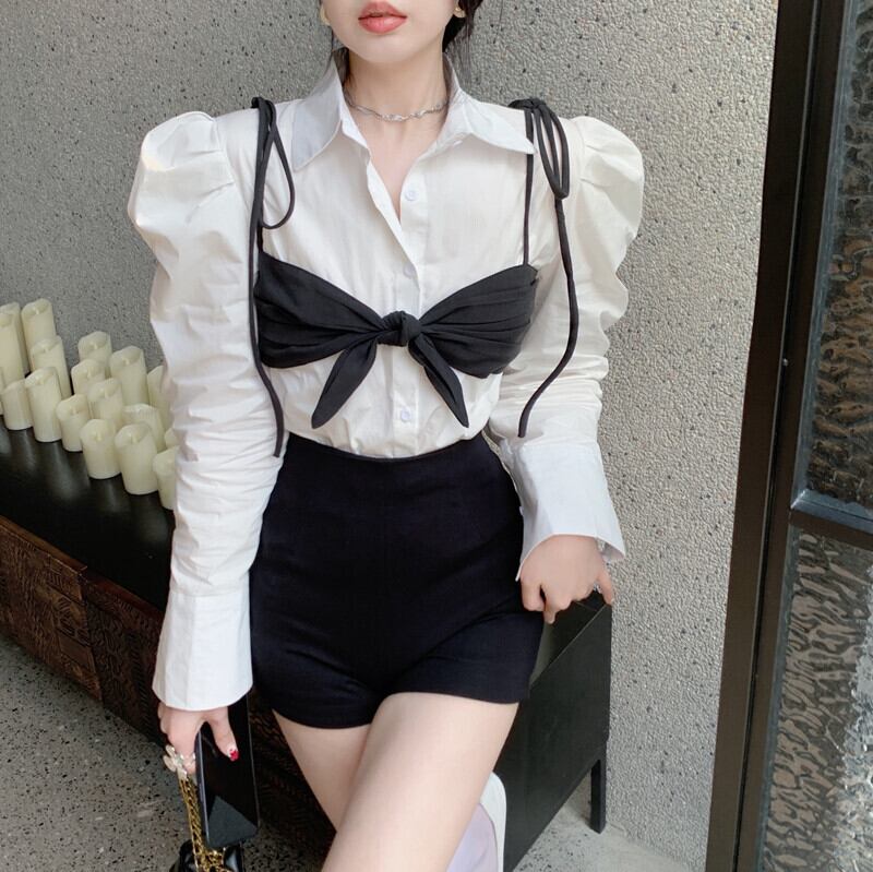 ノミクマパフスリーブターンダウンカラーブラウストップス+スウィートボウタイスリングベスト2022春の女性 リボン 大人ガーリー キュート カジュアル スプリング 春物 kor42300047573
