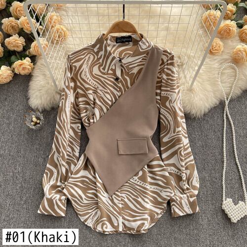 のみくまパッチワークフェイクツーピースブラウスレディース春長袖ストライプシャツ2022スリムウエスト ロング スプリング 春物 kor43620363348
