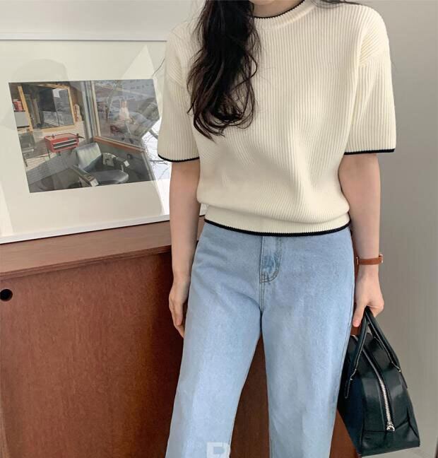 ノミクマヒットカラーOネック半袖ニットトップスCausalChicWoman Sweaters 2022 Spring Pullover Knitwear ショート ハーフスリーブ スプリング 春物 kor58539880484