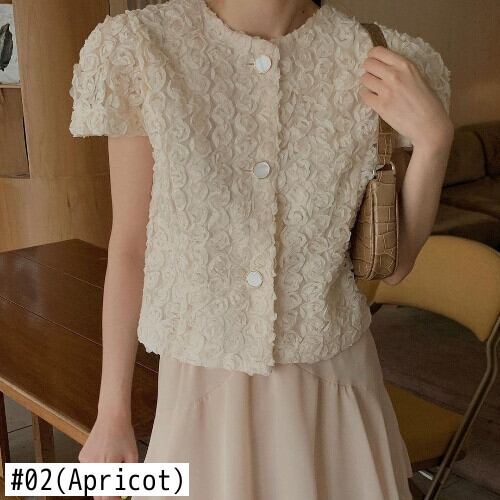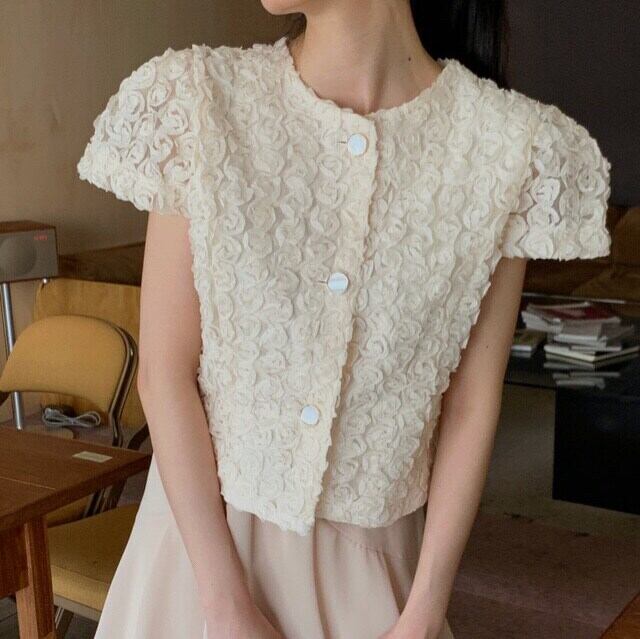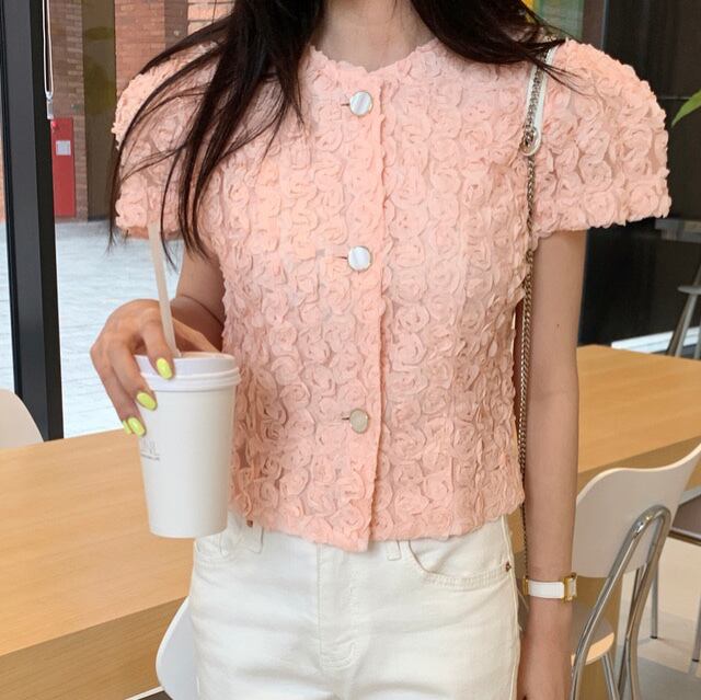 のみくまシック3DフックフラワーブラウスレディースパフスリーブシングルブレストOネックシャツ2022スウィートサマートップ 大人ガーリー キュート カジュアル 夏物 フラワーデザイン kor35999213934