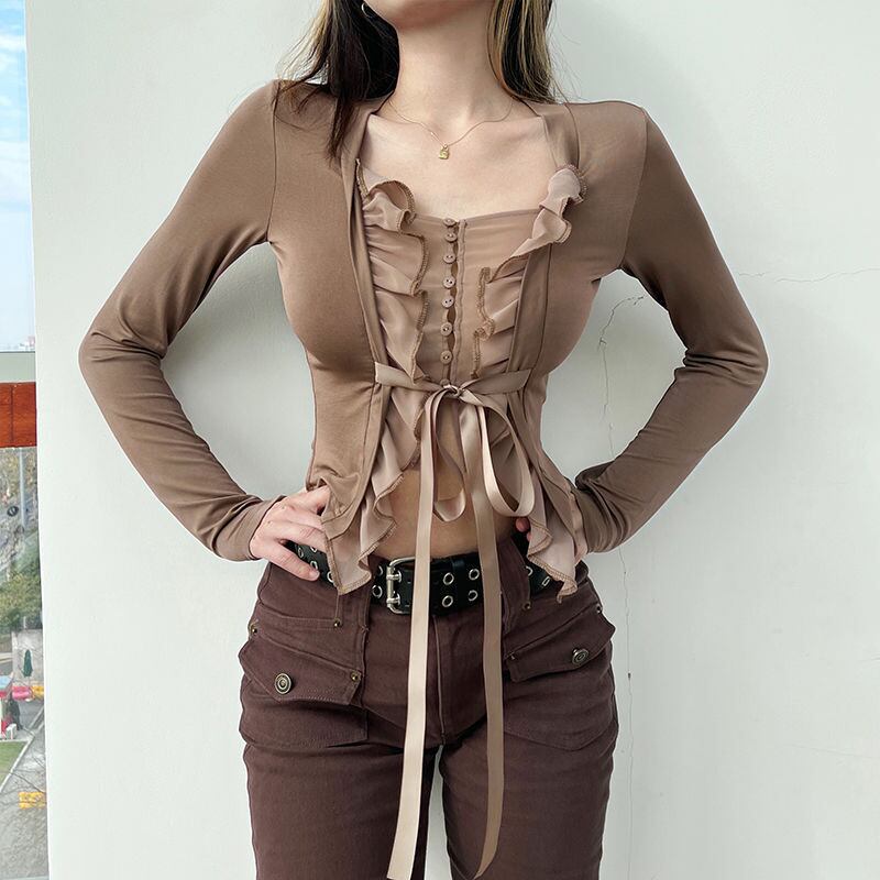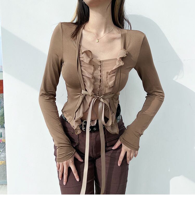 のみくまセクシーガーゼパッチワークウーマンTシャツシックなスクエアカラー長袖蝶ネクタイグラフィックTシャツスリムショートトップス ロング リボン スクウェア kor64882824889