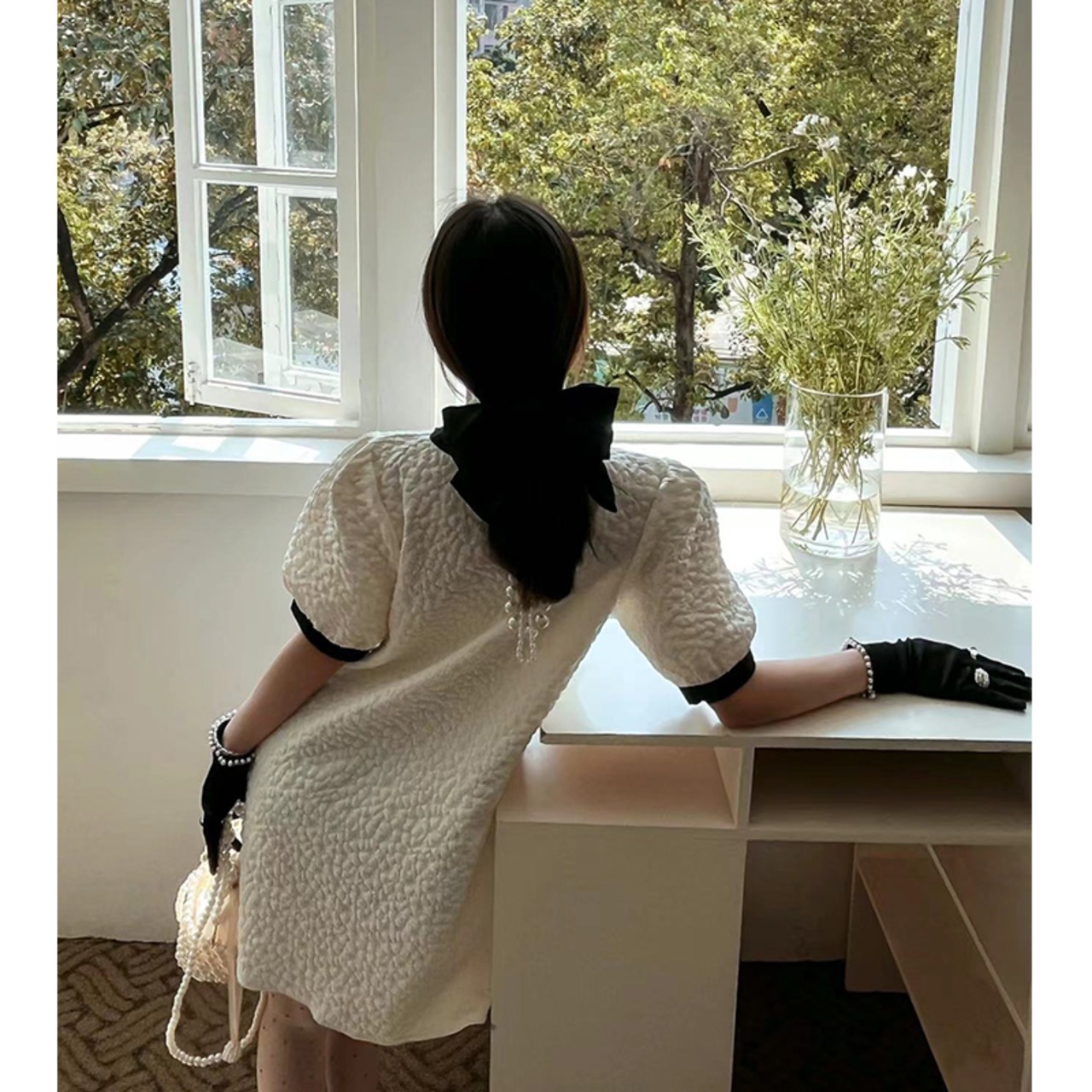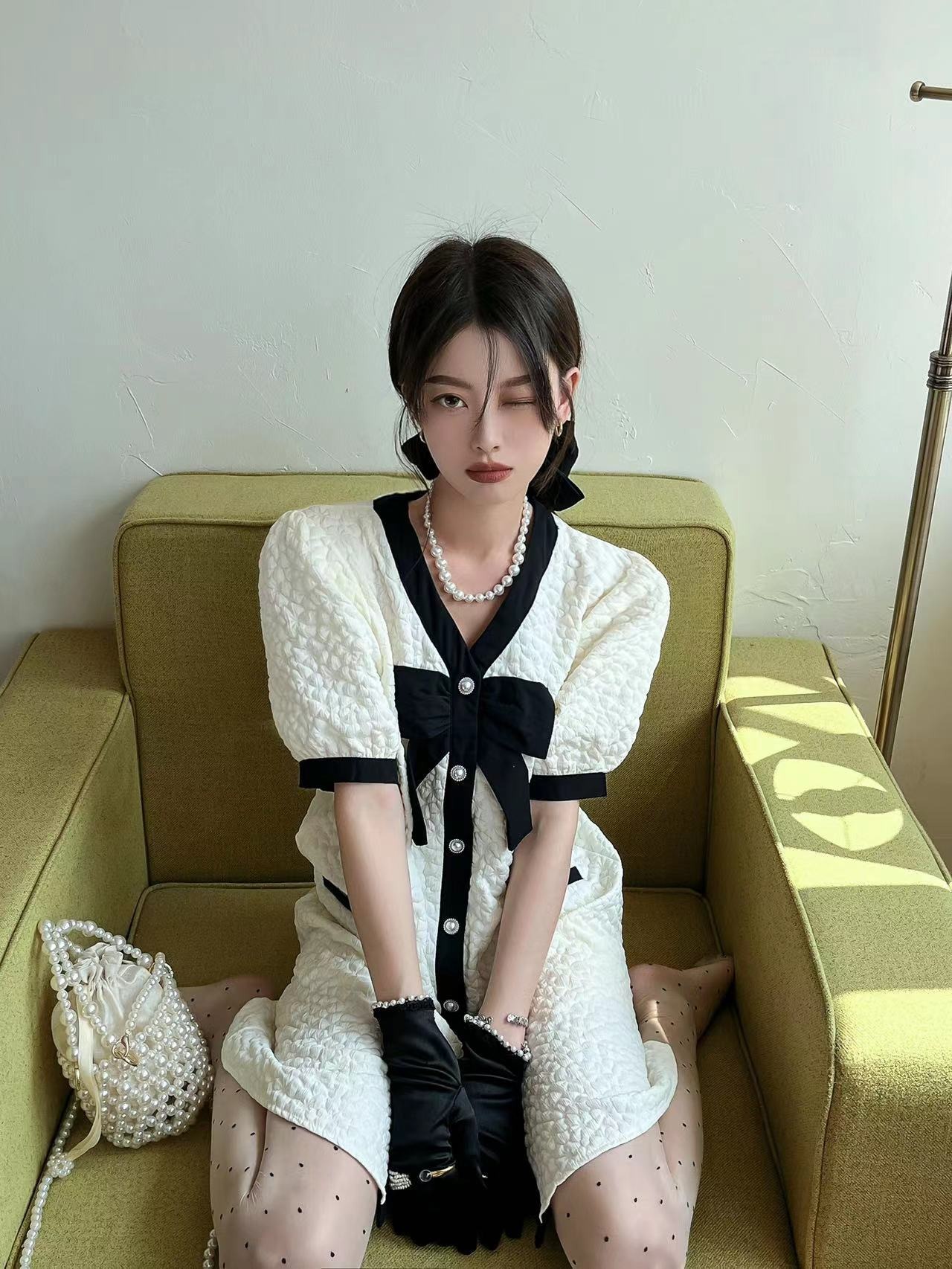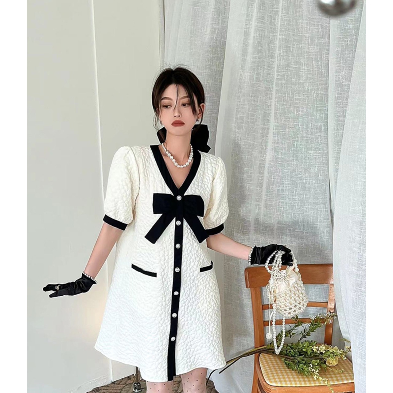 ノミクマサマーパフスリーブVネックウーマンドレスシングルブレストシックボウノットドレス2022ヒットカラーVestidosDe リボン 夏物 kor50015927429