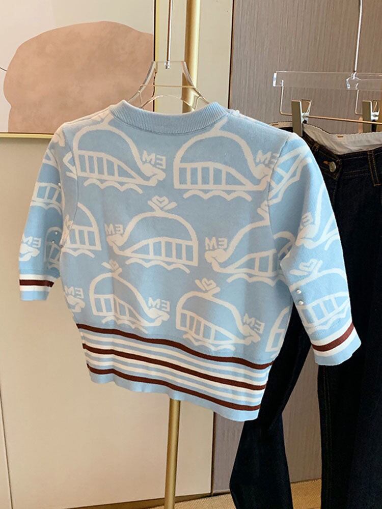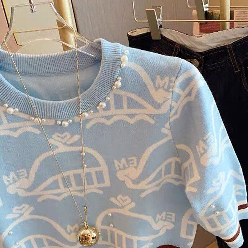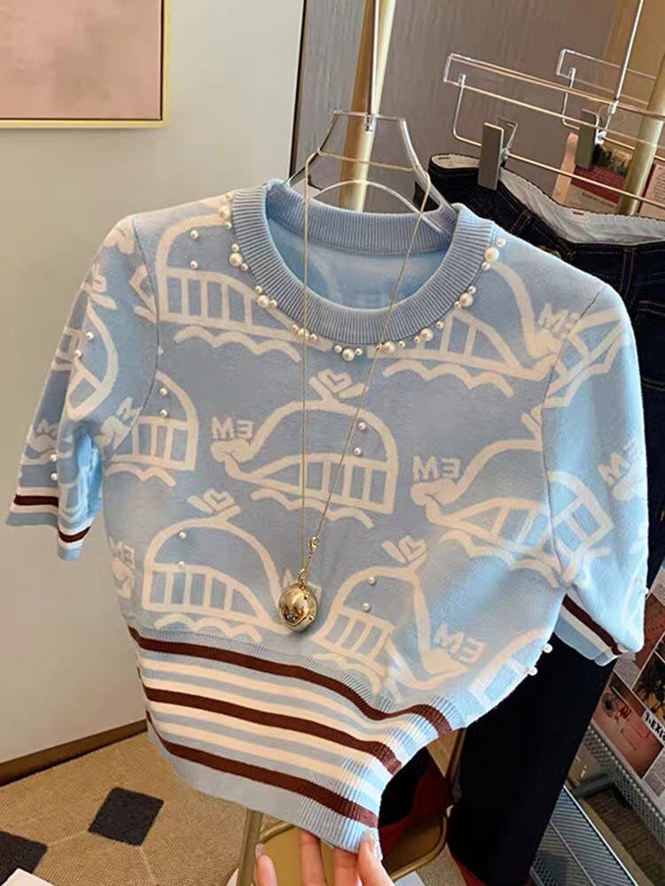 ノミクマシックな印刷パフスリーブセーター女性2022年春夏ニットトップビーズOネックヒットカラーストライププルオーバーニットウェア スプリング 春物 サマー 夏物 kor8062331513