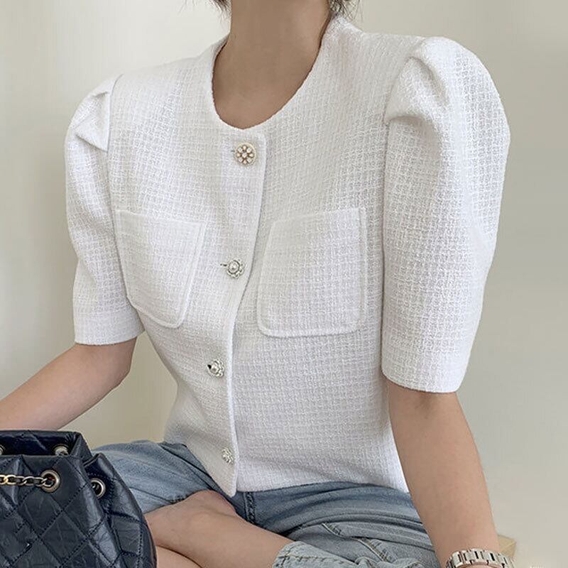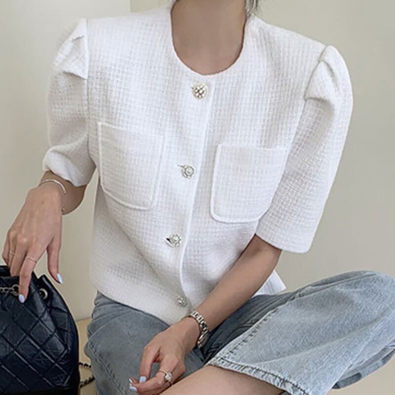 ノミクマツイードパフスリーブコートシックなシングルブレストOネックジャケット2022春のアウトウェアトップス スプリング 春物 kor37027722418