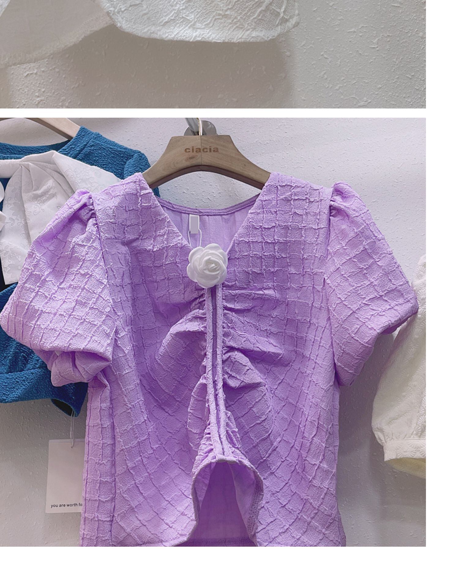 ノミクマ2022サマーウィメンズブラウスシックパフスリーブシフォンシャツ3DフラワーVネックシャーリングトップ 夏物 フラワーデザイン kor31987248583