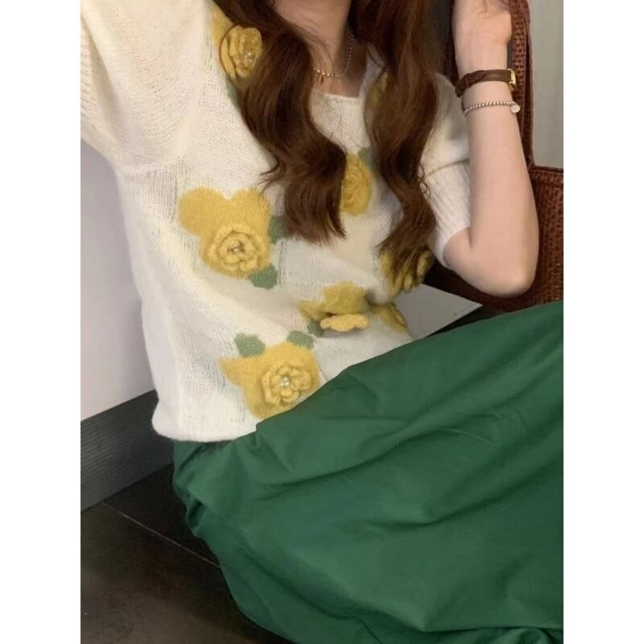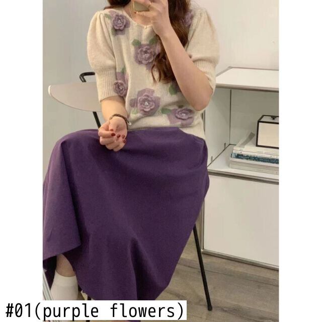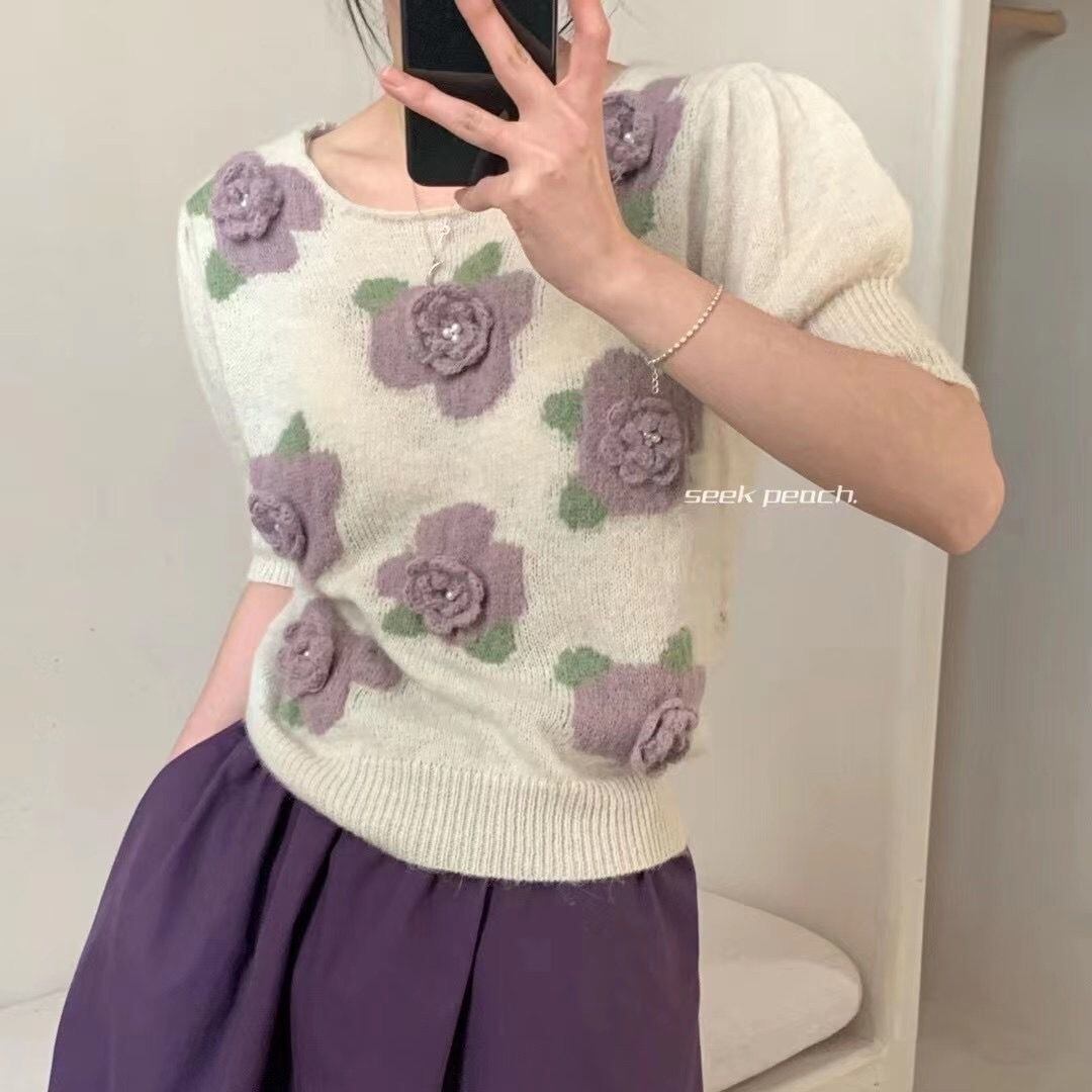 ノミクマフラワーズレディースセーター2022春夏パフスリーブOネックニットカジュアルスウィートプルオーバーニットトップス 大人ガーリー キュート スプリング 春物 サマー 夏物 フラワーデザイン kor14874970592