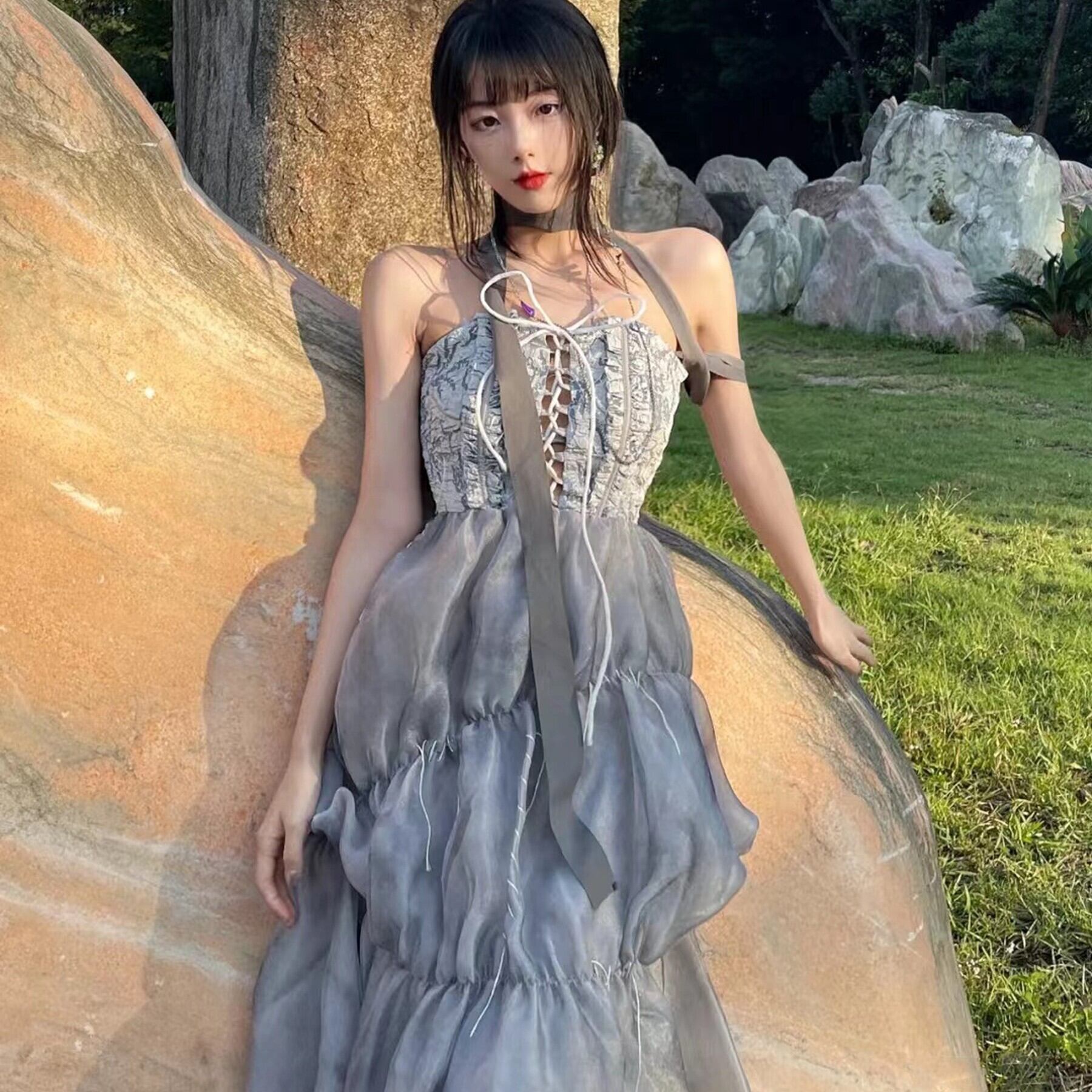 のみくまシック2022夏ノースリーブセクシーストラップレスロングドレス女性バンデージメッシュパッチワークロングドレスローブ サマー 夏物 kor81080023350