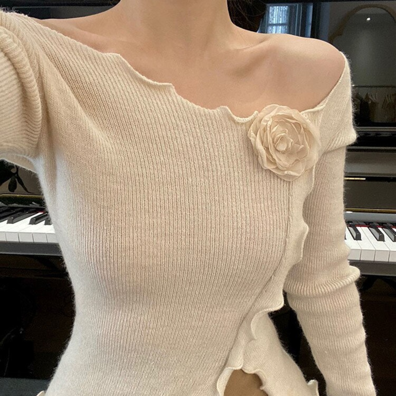 ノミクマフラワーセクシーストラップレス女性セーター長袖スリムスプリットニット2022Sprignベーシックニットトップス ロング フラワーデザイン kor6548878612