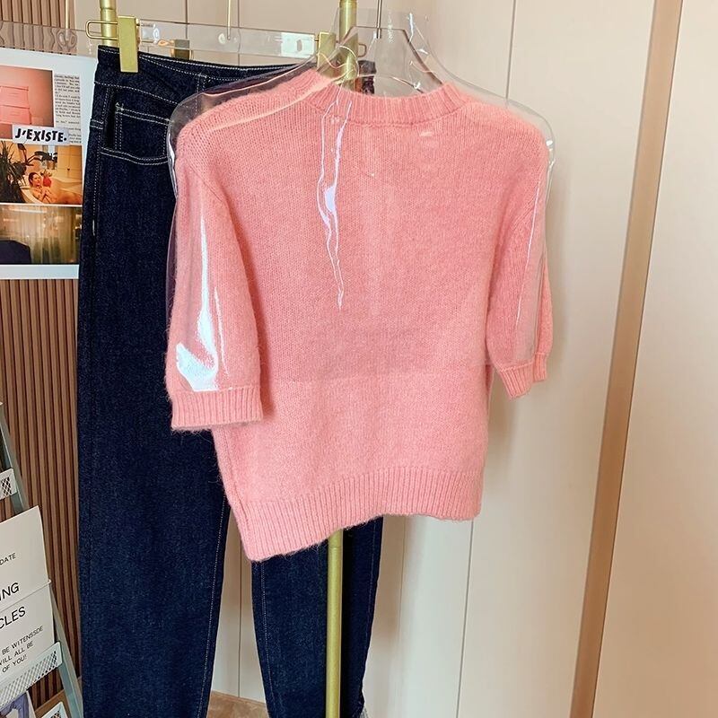 ノミクマ2022春ピンクニットトップスシックスウィートショートプルオーバーレターカジュアルパフスリーブベーシックセーター 大人ガーリー キュート スプリング 春物 kor87000390035