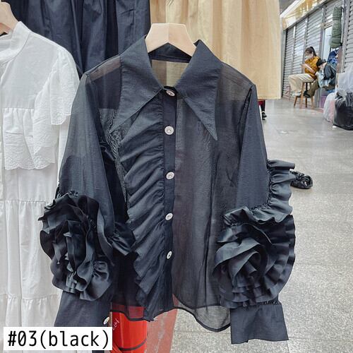 のみくまレディースブラウスシック3Dフラワーパフスリーブ2022春トップシャツ因果ターンダウンカラートップ スプリング 春物 フラワーデザイン kor63026028999