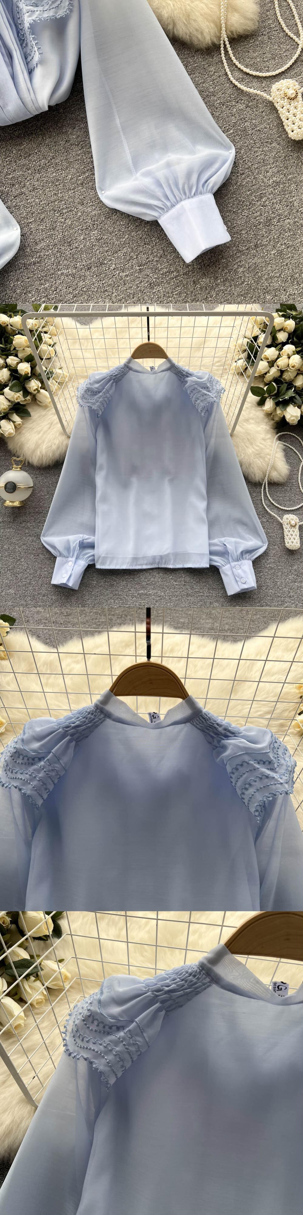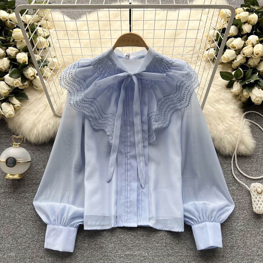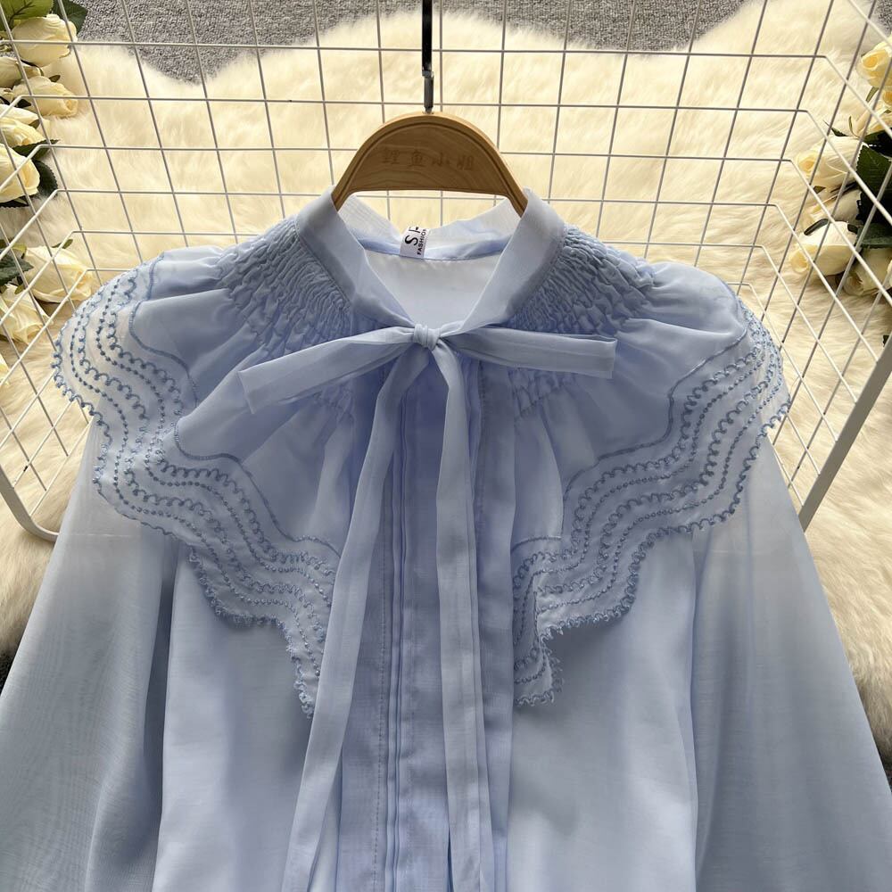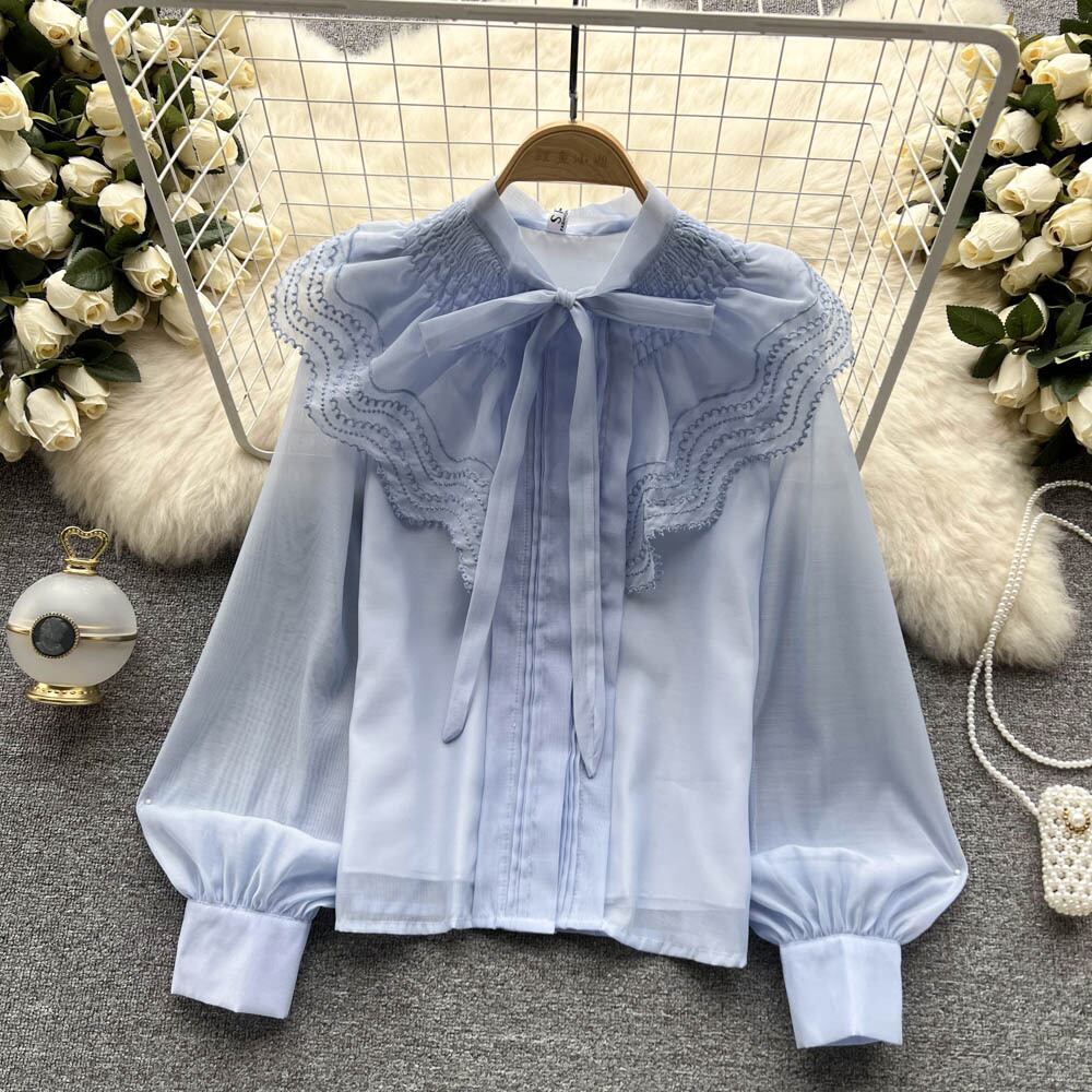 ノミクマ2022春の女性トップスシックなフリル蝶ネクタイピーターパンカラーブラウスカジュアルパフスリーブスウィートシャツ リボン 大人ガーリー キュート スプリング 春物 kor14179517071