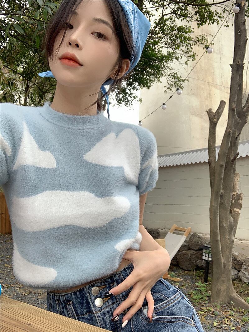 ノミクマクラウドニットTシャツ2022年春ニットウェア半袖トップスカジュアルショートセーターグラフィックTシャツ ハーフスリーブ スプリング 春物 kor10995368883