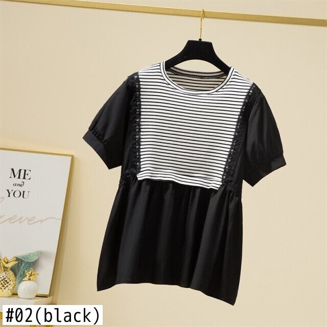 ノミクマ2022サマーウーマンTシャツシックパッチワークフェイクツーピースストライプグラフィックTシャツカジュアル半袖Oネックトップス ショート ハーフスリーブ 夏物 kor3790143896