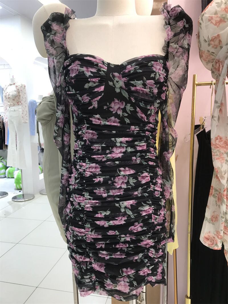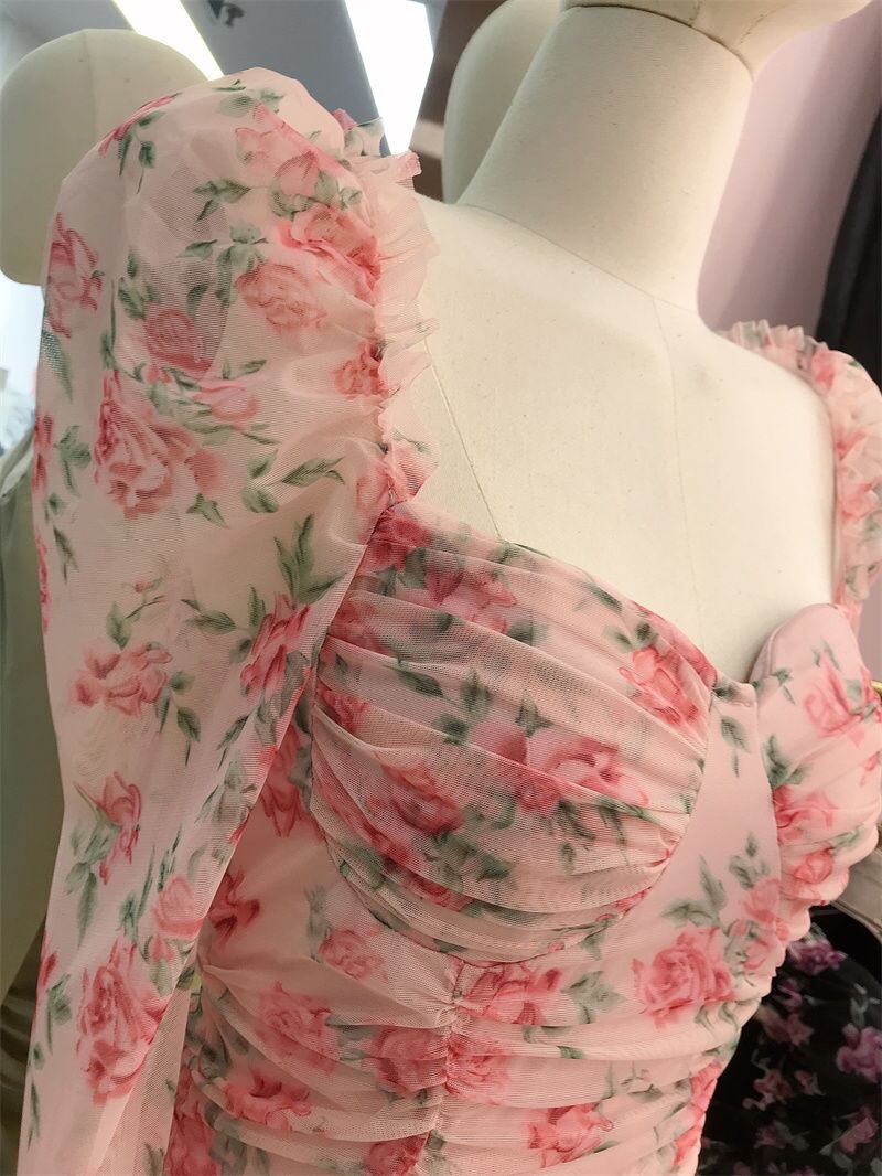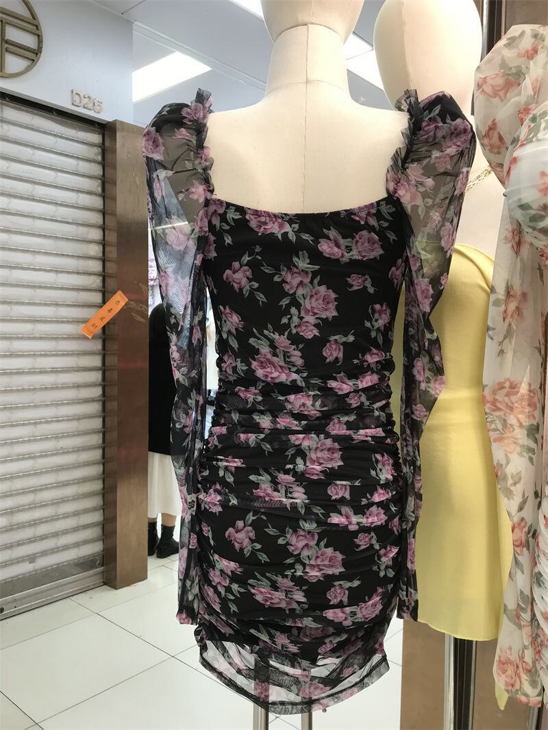 のみくまスクエアカラーフローラルシフォンドレス女性長袖スリムドレス2022VestidosDe ロング 花柄 スクウェア kor68947370200