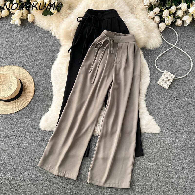 ノミクマ2022春夏レディーススーツパンツレースアップウエストロングパンツCausalSolidWide Leg Pants スプリング 春物 サマー 夏物 ワイドレッグ ワイドパンツ ソリッドカラー kor92576300346