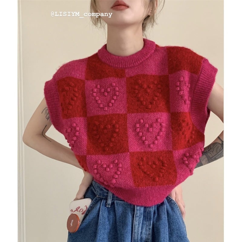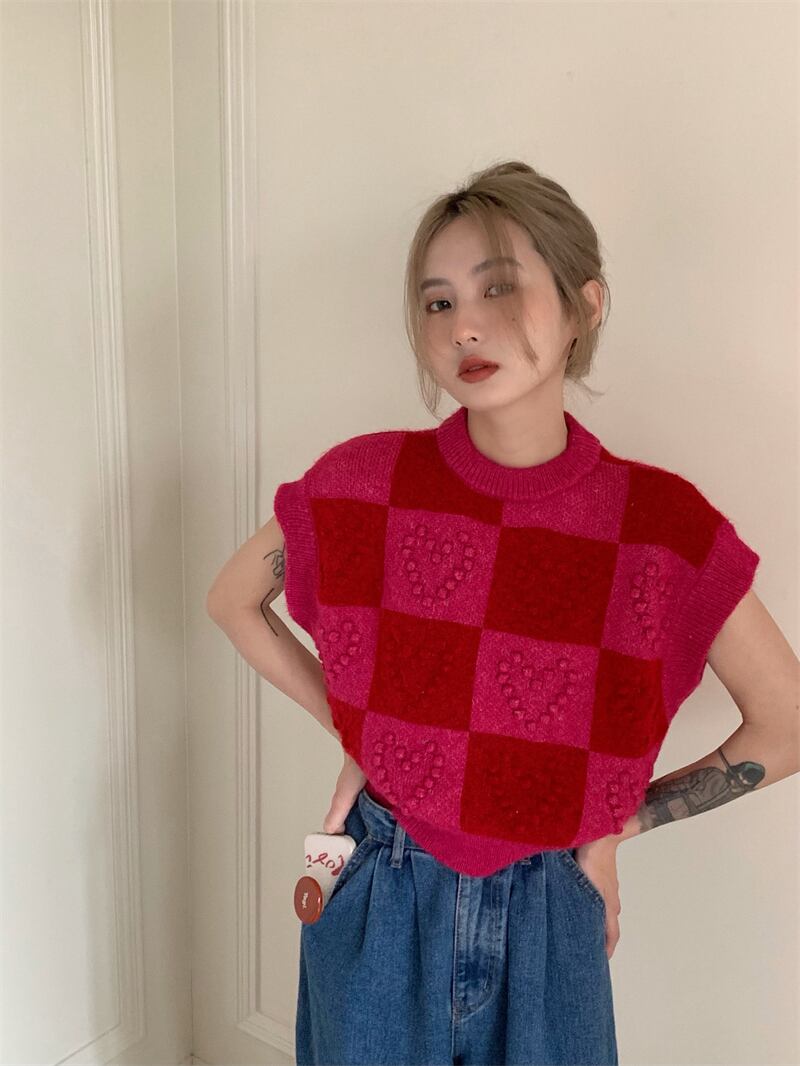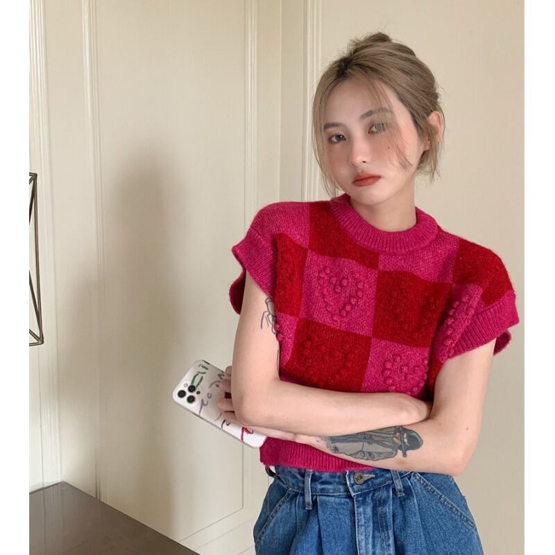 ノミクマコントラストカラーチェック柄プルオーバーニットカジュアルノースリーブOネックニットトップス2022春女性セーター スプリング 春物 kor11502166186