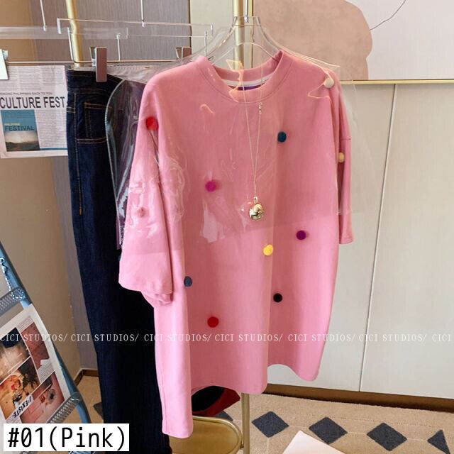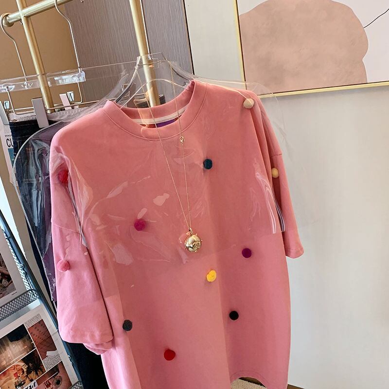 のみくまシック3DファーボールパッチワークウーマンTシャツ半袖OネックグラフィックTシャツ2022年春夏トップスシャツ ショート ハーフスリーブ スプリング 春物 サマー 夏物 kor64268110215