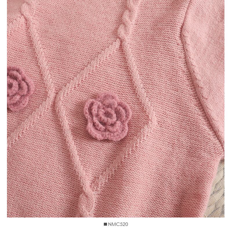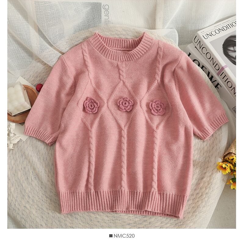 のみくまカジュアルツイスト半袖ニットTシャツレディース夏薄Tシャツシックな3DフラワーOネックプルオーバーTシャツ ショート ハーフスリーブ サマー 夏物 フラワーデザイン kor47368294571