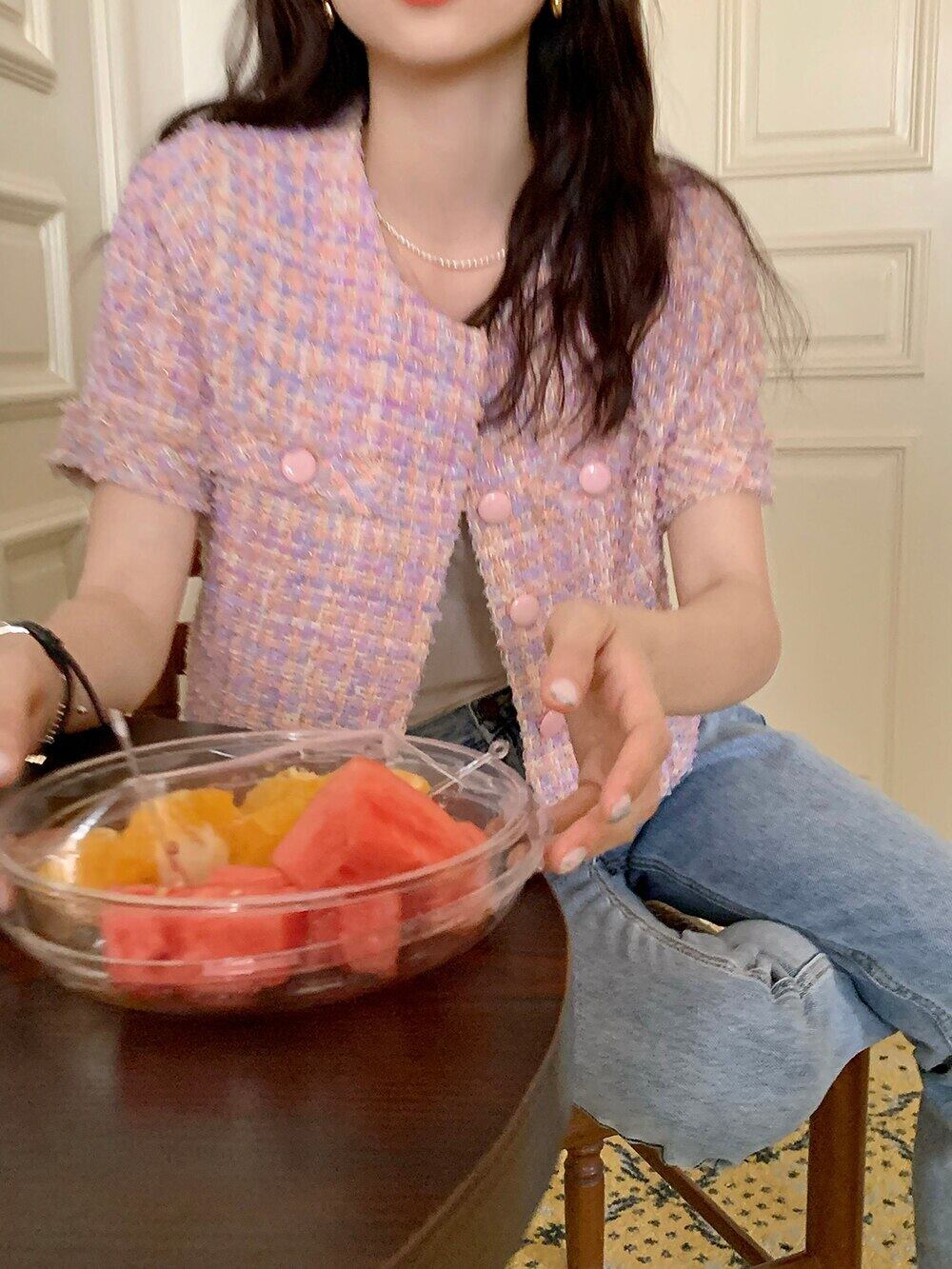 Nomikuma Causal Tweed Short Coat Women Chic Summer O-neck Jacket 2022 Single Breasted Outwear Tops ショート サマー 夏物 Oネック kor77760732016