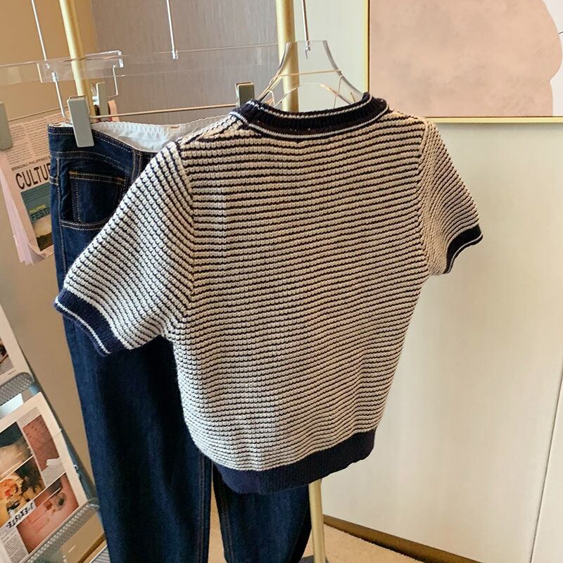 ノミクマヒットカラーストライプ半袖セーター女性2022年春夏ニットカジュアルOネックプルオーバーニットトップス ショート ハーフスリーブ スプリング 春物 サマー 夏物 kor30996311253