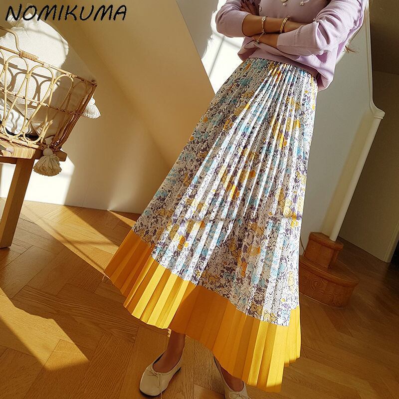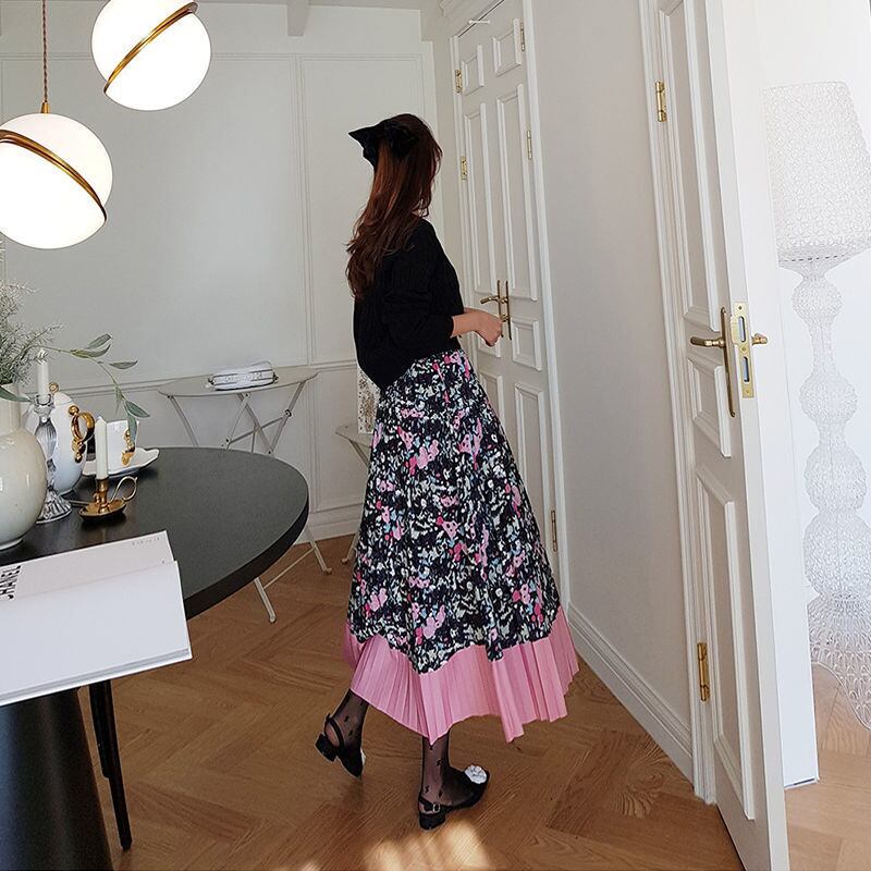 のみくまコントラストカラーフローラルシフォンスカートレディースウエストボトム原因Aラインプリーツスカート2022 花柄 kor35661618065