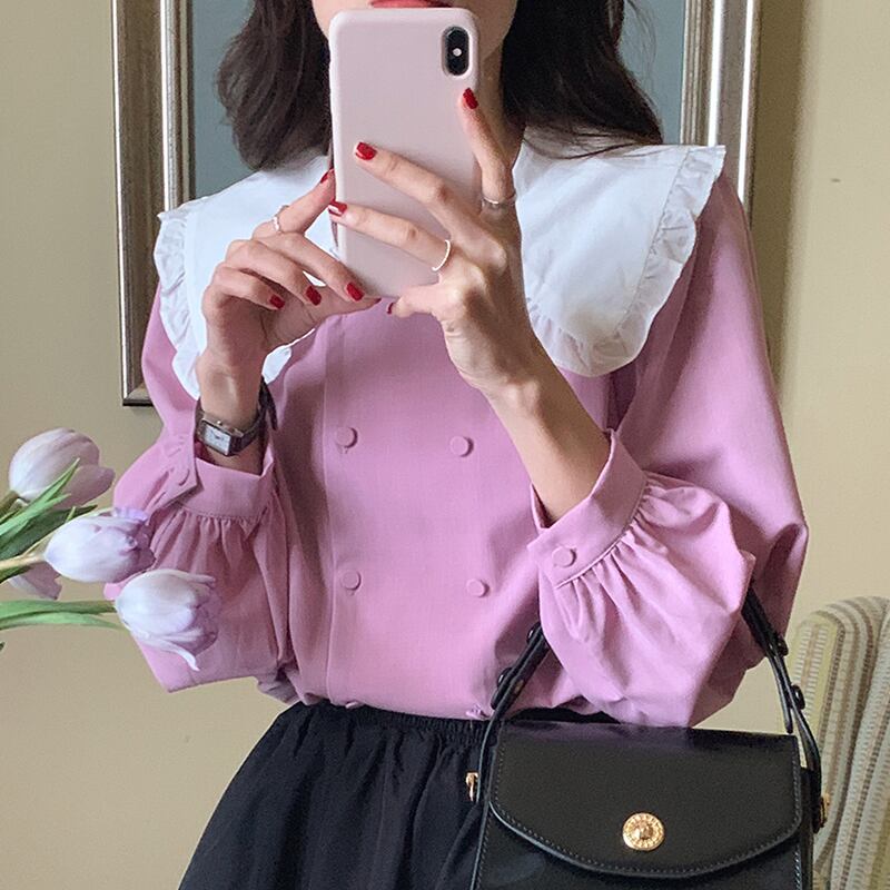 のみくまスウィートヒットカラーピーターパンカラーブラウストップスカジュアルダブルブレストパフスリーブウーマンシャツ2022年春 大人ガーリー キュート スプリング 春物 kor43821382790