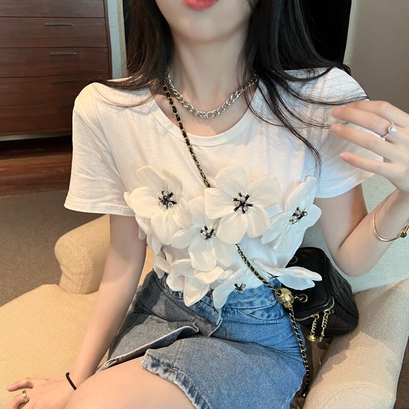 のみくまビーズ3DフラワーウーマンTシャツ半袖OネックTシャツトップスCausal2022春夏グラフィックTシャツ ショート ハーフスリーブ スプリング 春物 サマー 夏物 フラワーデザイン kor61025384017