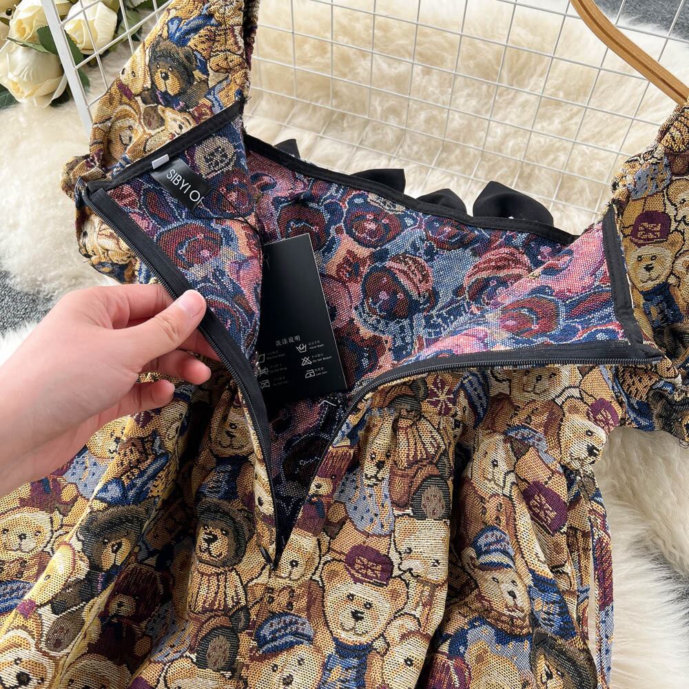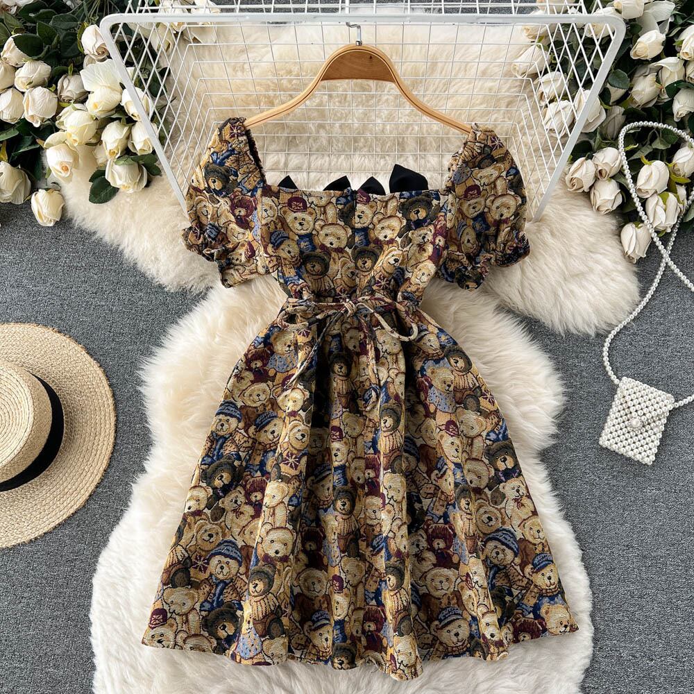 のみくまスウィート漫画プリントドレス女性2022年夏ウエストAラインVestidoシックパフスリーブボウノットスラッシュネックドレス リボン 大人ガーリー キュート カジュアル サマー 夏物 kor26899031743