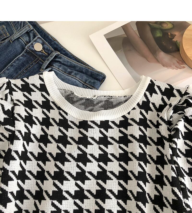 KUSAHIKIヒットカラーチェック柄プルオーバーニットシックパフスリーブOネックウーマンセーター2022春夏ニットトップス スプリング 春物 サマー 夏物 kor61540460125