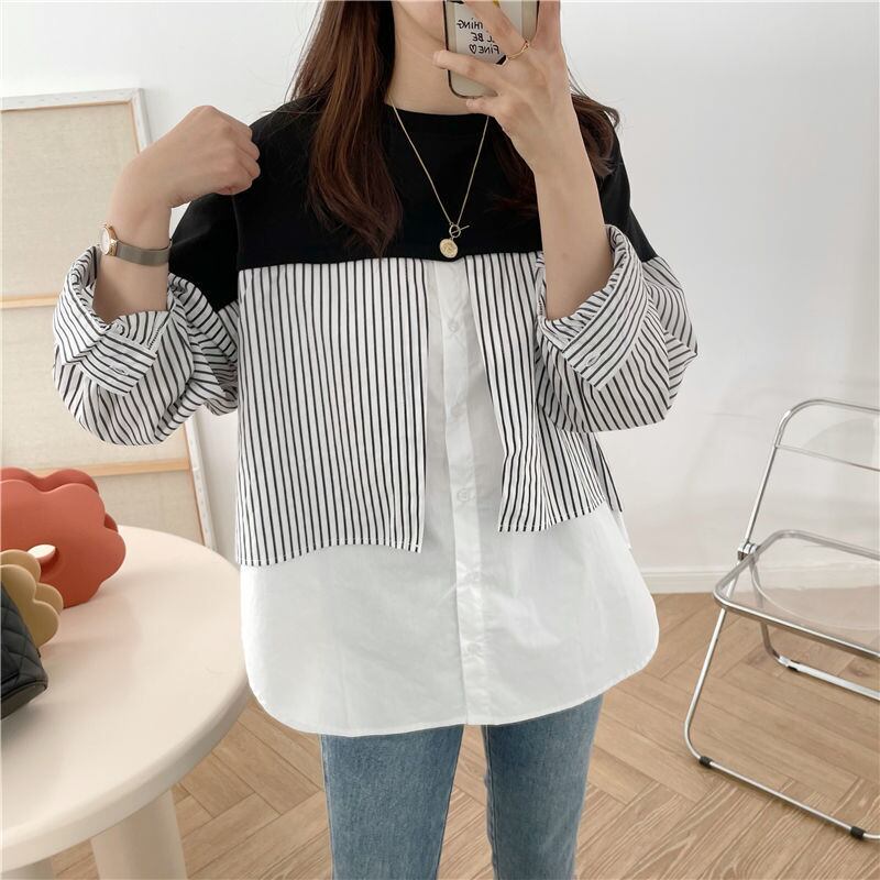 のみくまフェイクツーピースヒットカラーパッチワークブラウス女性因果長袖シャツ2022SpringDe Moda ロング スプリング 春物 kor93615873728