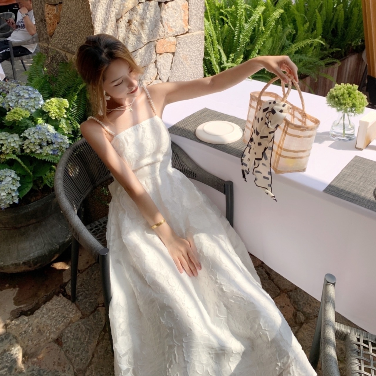のみくまスウィートボウノットシックなドレスレディースサマービーズスパゲッティストラップVネックウエストロングドレスVestidos リボン 大人ガーリー キュート カジュアル 夏物 kor57516820079