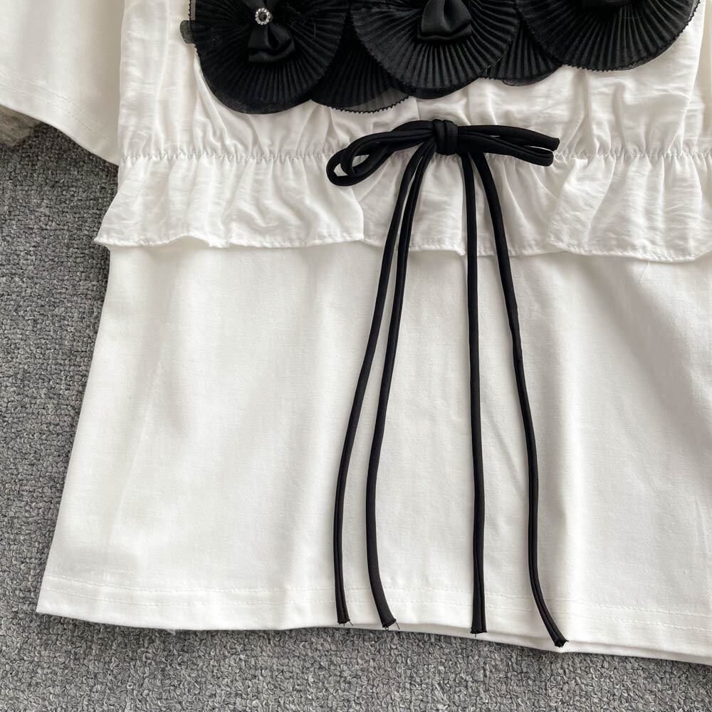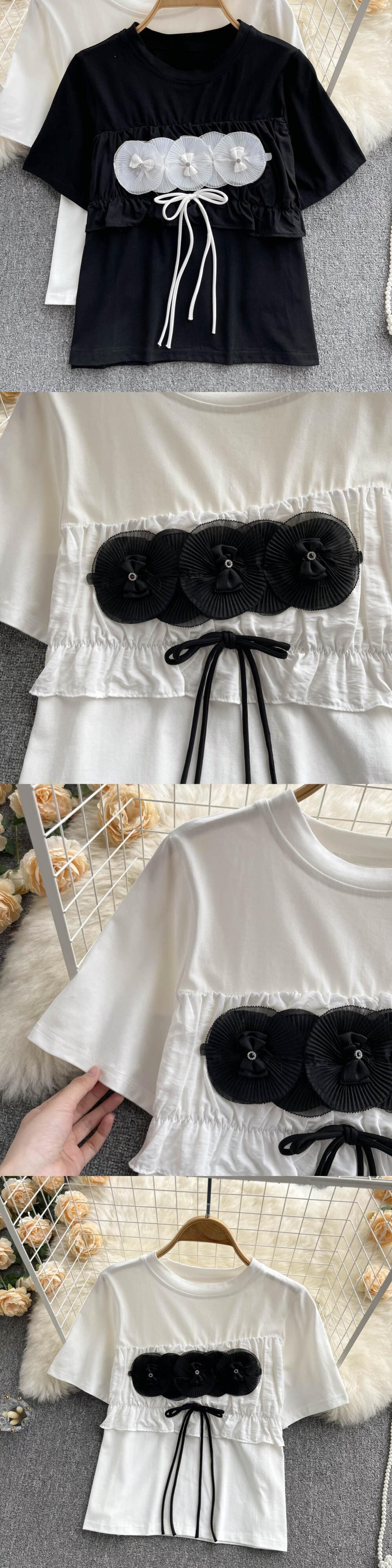 のみくまシックビーズ蝶結び3DフラワーウーマンTシャツ半袖2022夏グラフィックTシャツ因果スウィートトップスTシャツ ショート リボン ハーフスリーブ 大人ガーリー キュート カジュアル サマー 夏物 フラワーデザイン kor43977863565