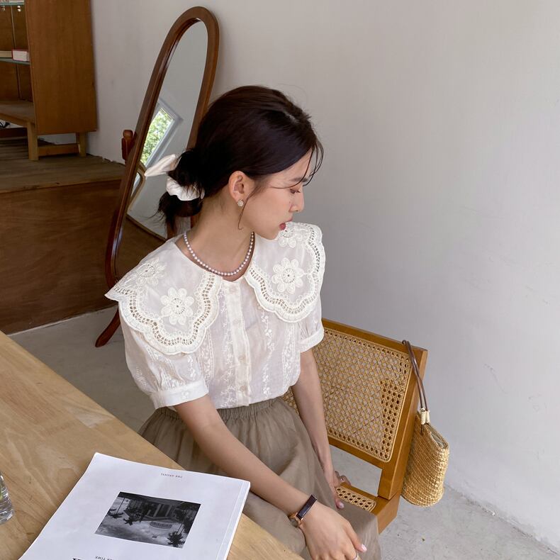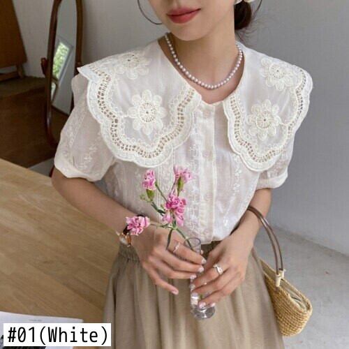 のみくまシック刺繡レーススウィートトップスパフスリーブピーターパンカラーブラウス因果女性2022年夏 刺繍 大人ガーリー キュート カジュアル サマー 夏物 kor98283526473
