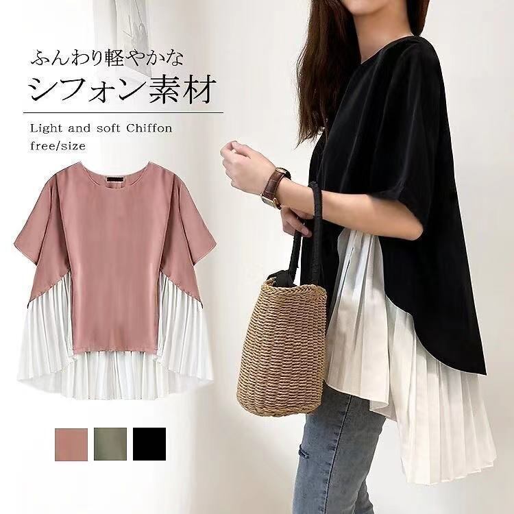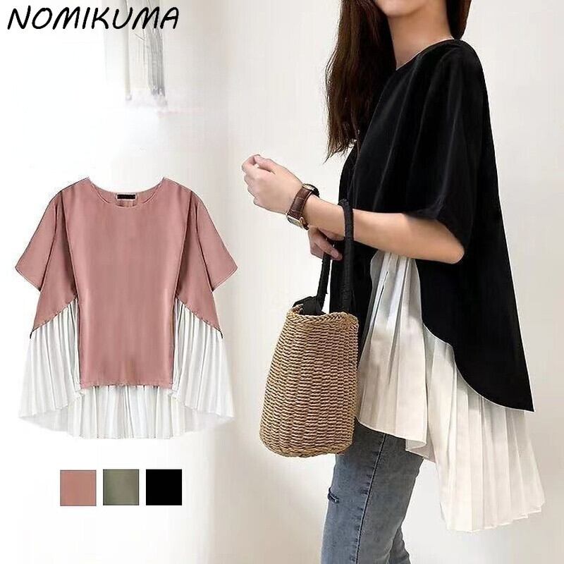 のみくま因果ヒットカラーパッチワークレディースブラウス半袖Oネックシャツ2022サマールーススタイルデ ショート ハーフスリーブ 夏物 kor49910268747