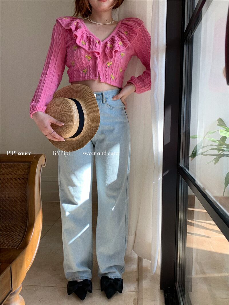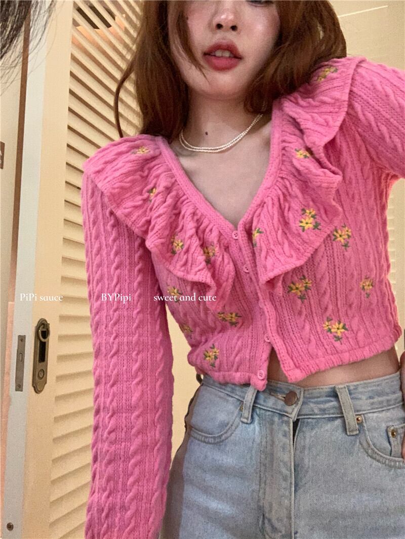 のみくまシックフリル花刺繡ニット長袖Vネックスリムクロップカーディガン2022シングルブレストスリムセーターコート ロング 刺繍 花柄 kor62088912209