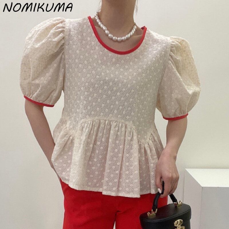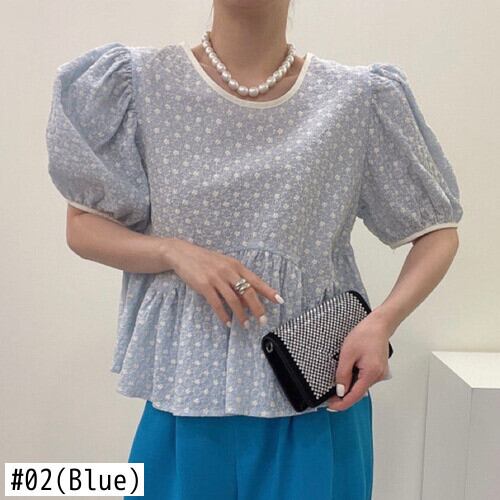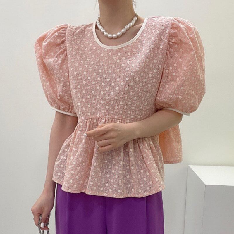 ノミクマシックサマーフローラルドールシャツカジュアルOネックパフスリーブレディースブラウス2022スウィートフリル 大人ガーリー キュート 夏物 花柄 kor17559913677