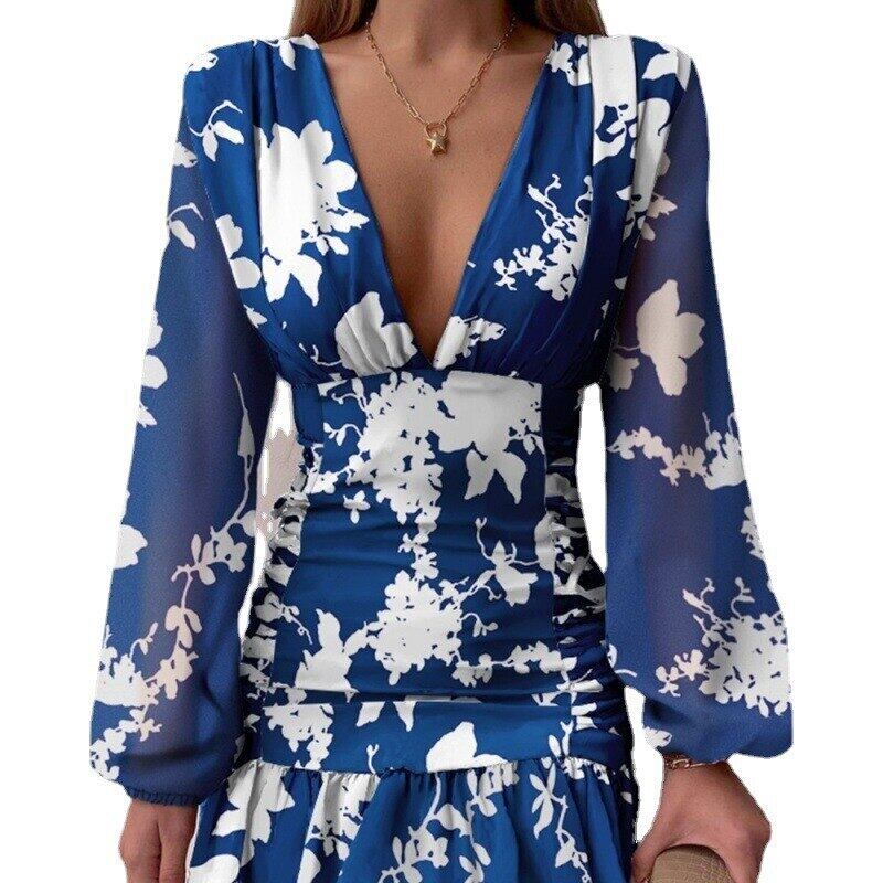 のみくま2022プリントワンピース長袖Vネックウーマンワンピーススプリングウエストフリルラインミニヴェスティド ロング 春物 ドレス kor18722398382