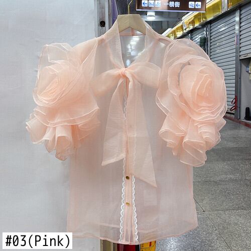 のみくま2022夏3DフラワーフリルパースペクティブシャツレディースシックボウバンデージVネックシャツトップス リボン サマー 夏物 フラワーデザイン kor46137867202