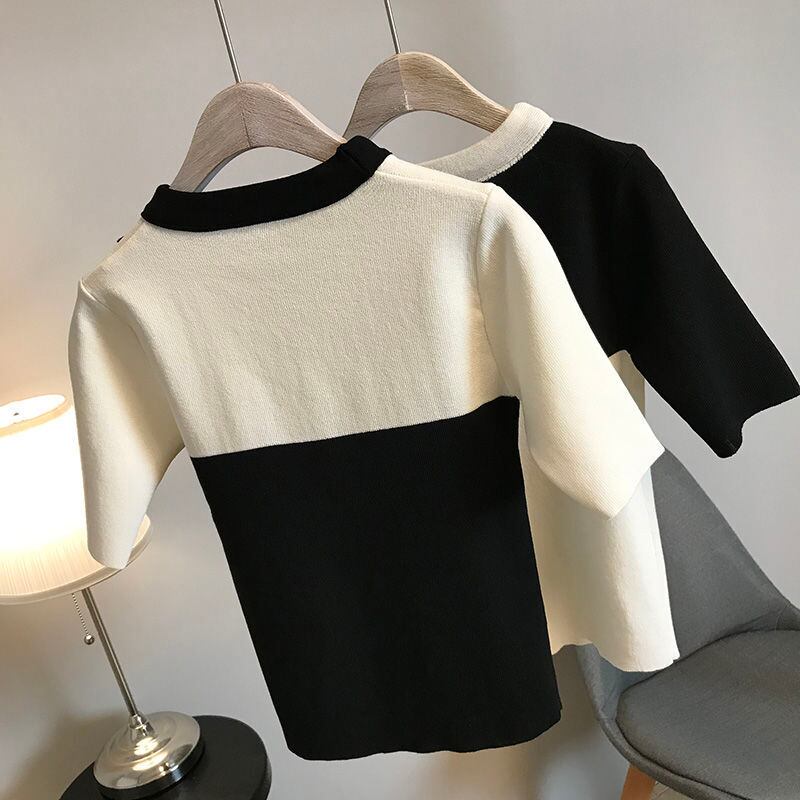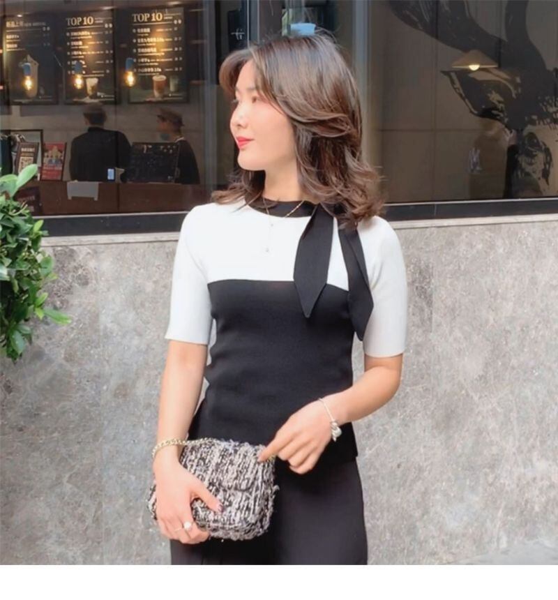 ノミクマ春夏シンヒットカラーニットトップシックボウノットOネック半袖ニット2022Fahsionスリムレディースセーター ショート リボン ハーフスリーブ スプリング 春物 サマー 夏物 kor16132186161