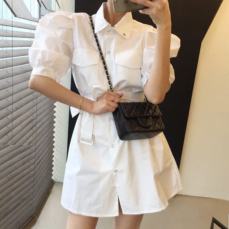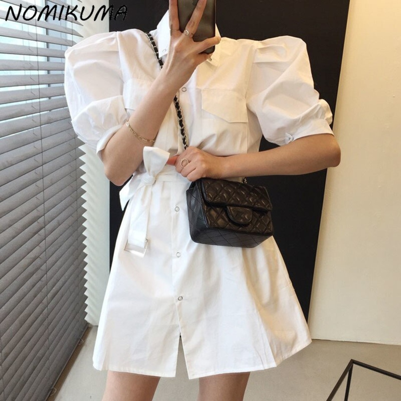 ノミクマシックサマーパフスリーブドレスターンダウムカラーシングルブレストボウバンデージスリムウエストウーマンドレス リボン 夏物 kor96433625265