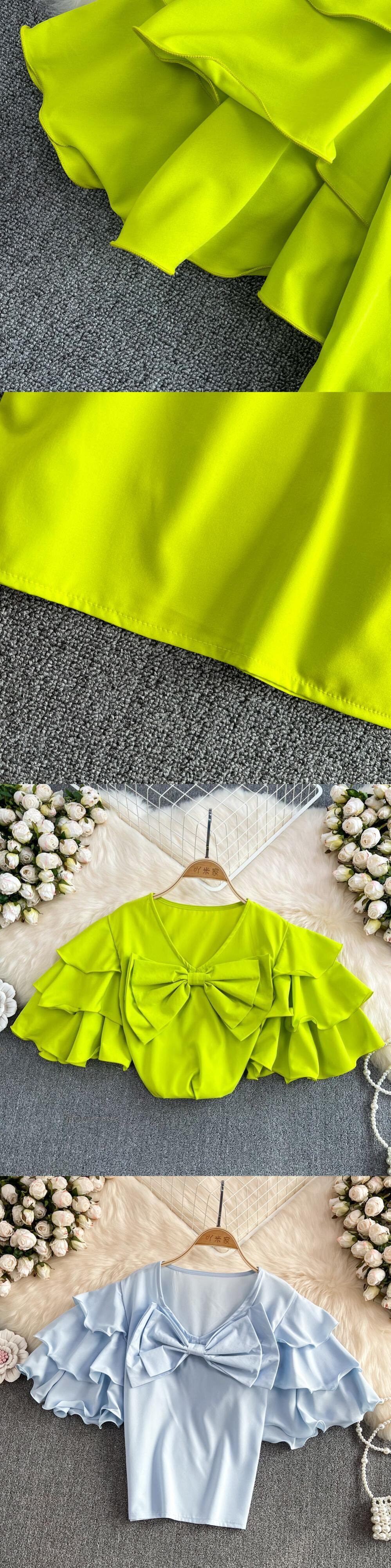 ノミクマ2022サマーレディーストップスシックなレイヤードバタフライスリーブプルオーバーブラウスカジュアルVネックソリッドショートシャツ レッド 夏物 ソリッドカラー kor21381214192