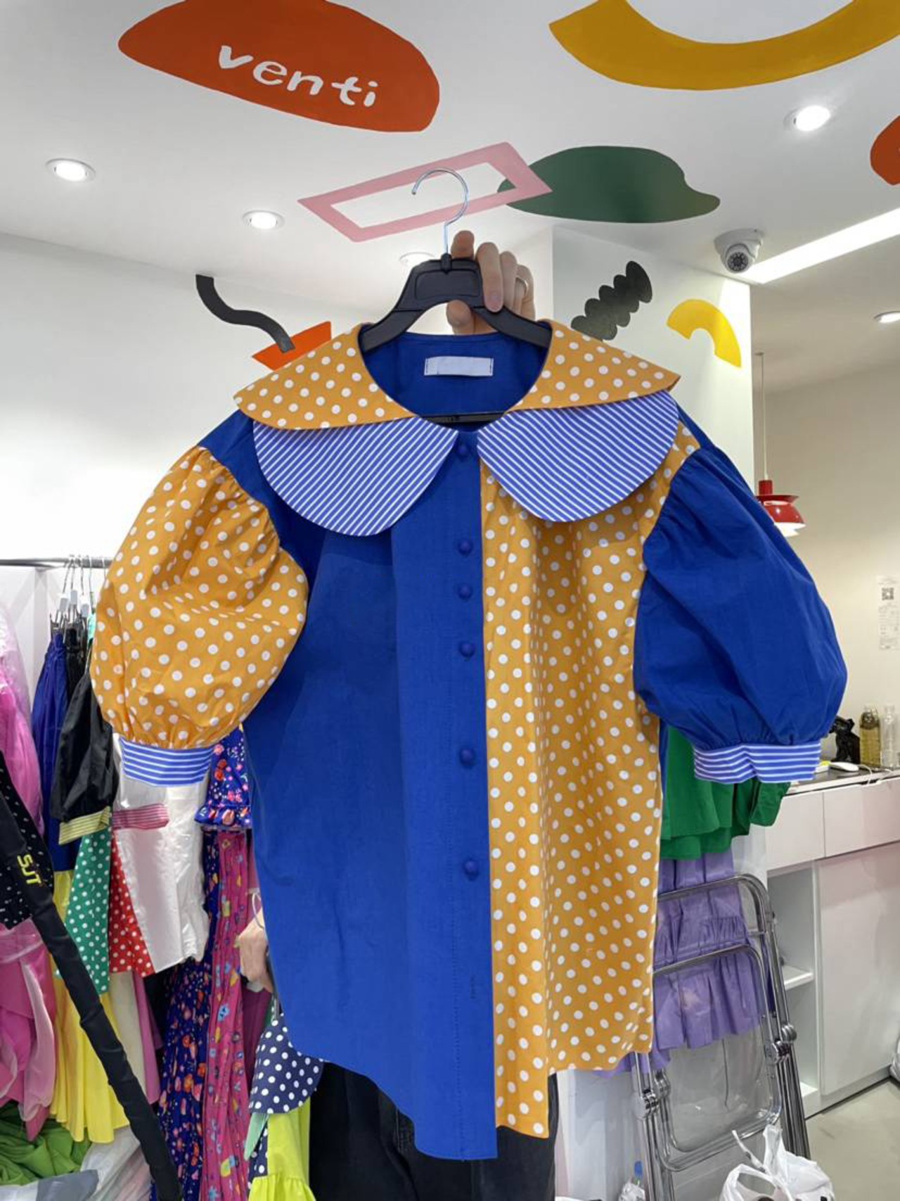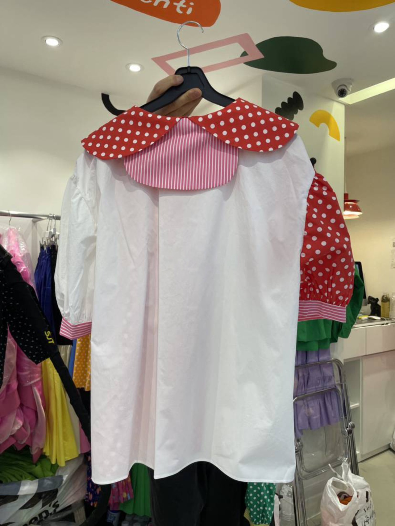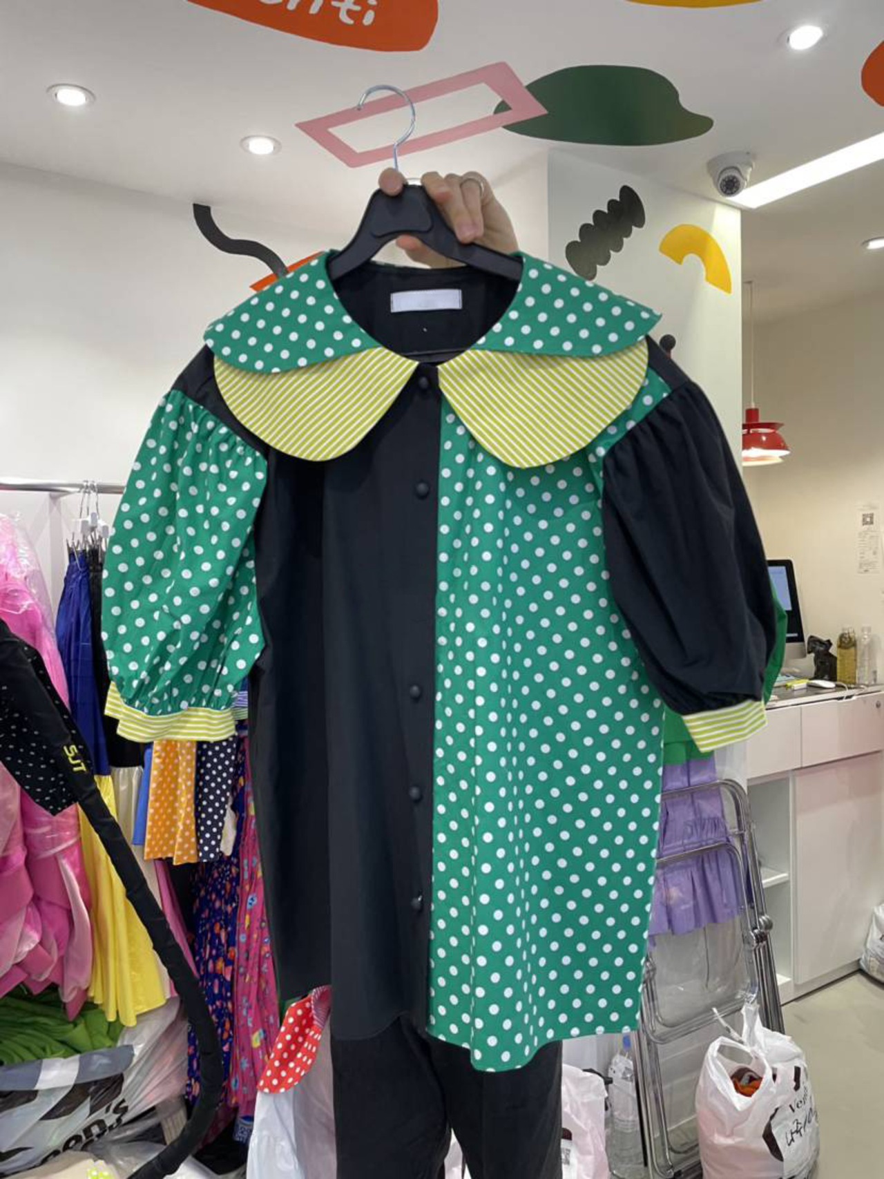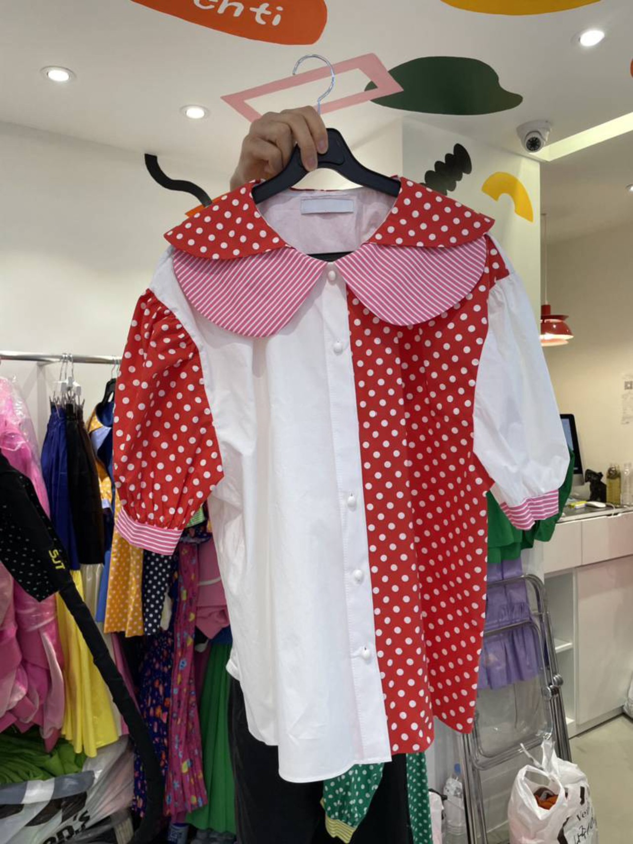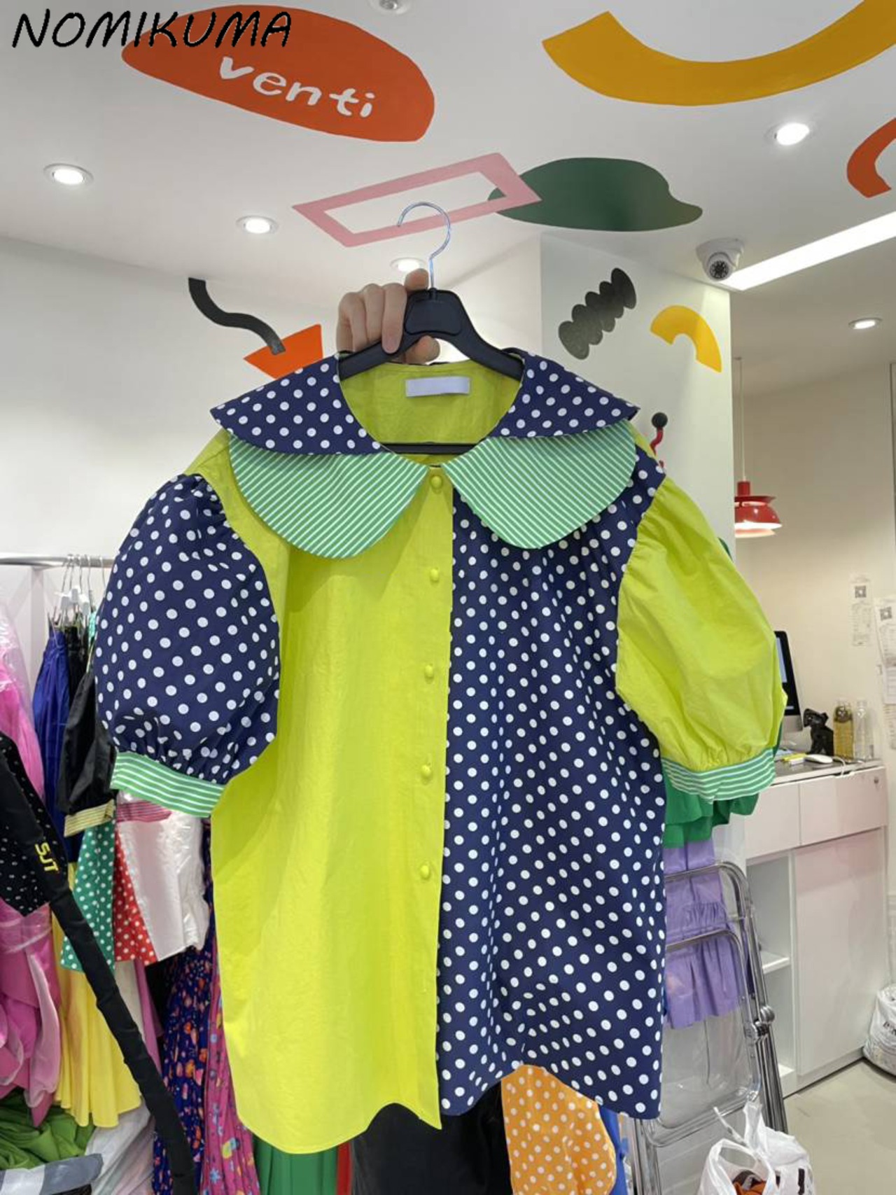 のみくまコントラストカラードットブラウストップススウィートピーターパンカラーパフスリーブウーマンシャツ2022夏 大人ガーリー キュート カジュアル サマー 夏物 kor50605695259