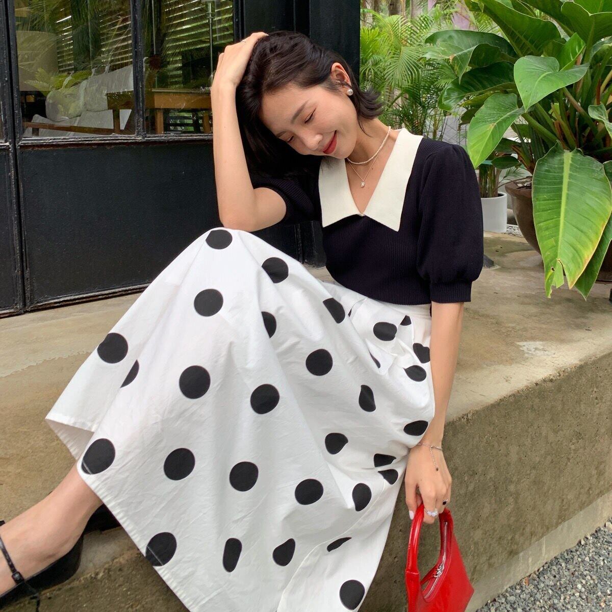 ノミクマヒットカラーターンダウンカラーセーターCausalPuffスリーブニット2022サマーニットトップス 夏物 kor64110572032