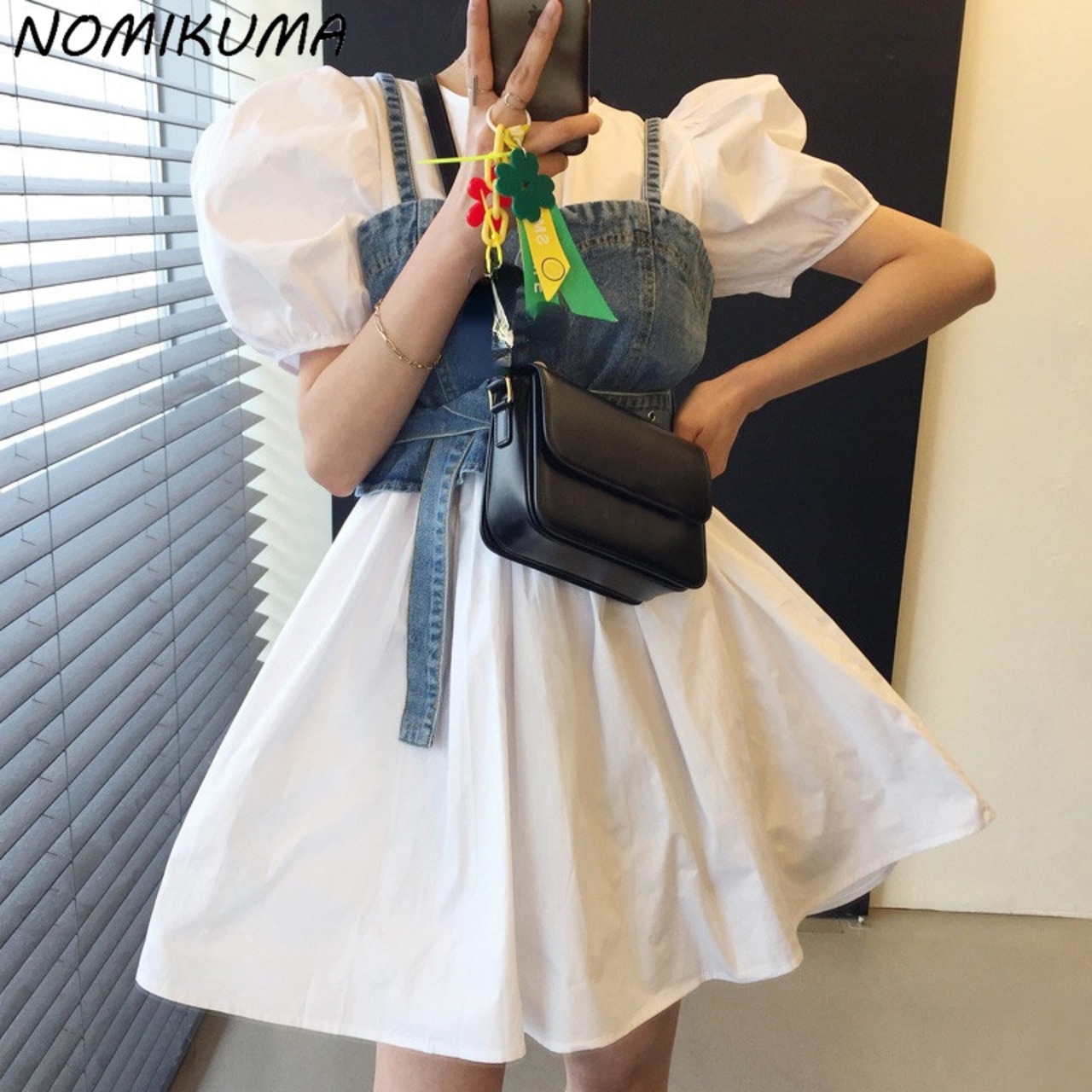 のみくまツーピースウーマンドレスパフスリーブOネックブラウスワンピース+デミンベルトスリムウエストタンクベスト2022スウィート衣装 大人ガーリー キュート カジュアル ハーネス kor5818095667