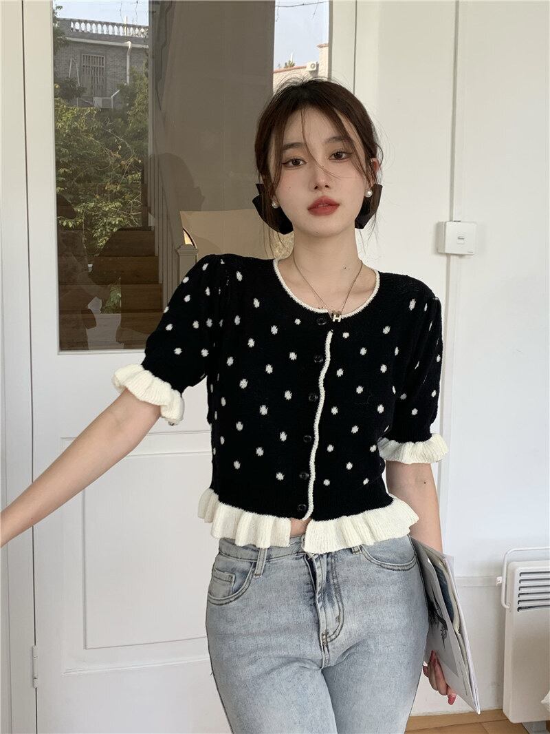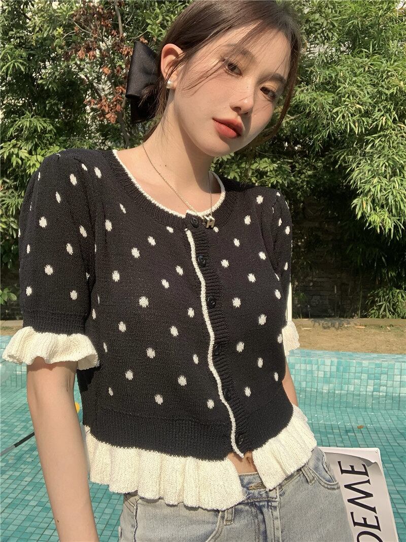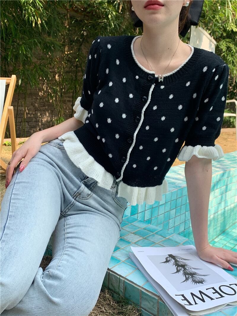 のみくまサマースウィートドットニットパフスリーブカーディガンシングルブレストOネックレディースセーター2022ショートニットコート 大人ガーリー キュート カジュアル 夏物 kor30573177251