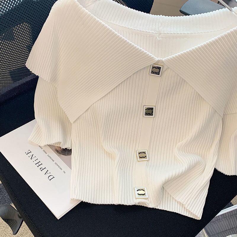 のみくまスウィートオフショルダーニットトップス2022夏半袖ニットシックなボタンクロッププルオーバーショートセーター ハーフスリーブ 大人ガーリー キュート カジュアル サマー 夏物 kor76901341466